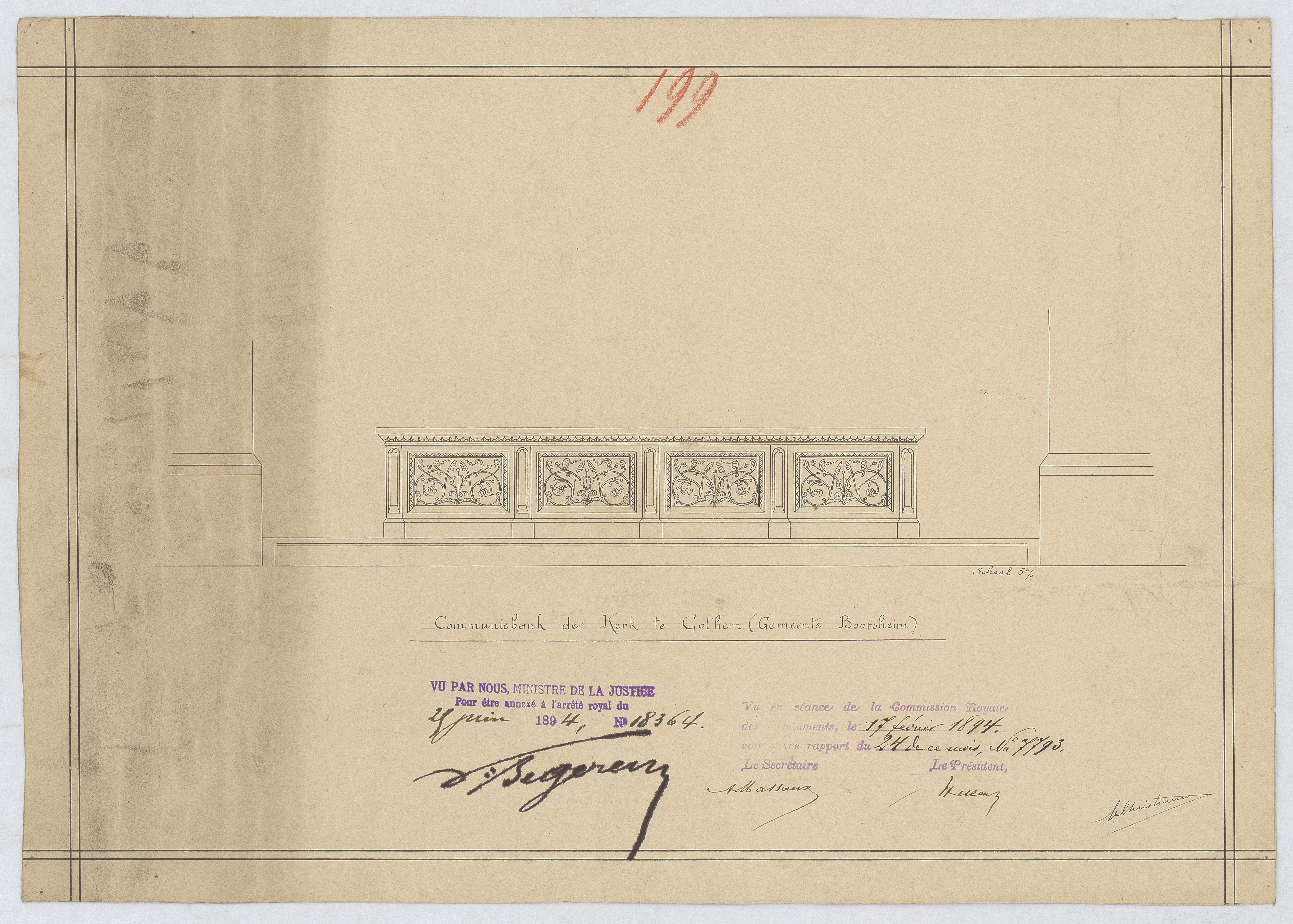Opschrift: Communiebank der kerk te Cothem (gemeente Boorsheim) Omschrijving plan: ontwerp communiebank Datum KCML: 17/02/1894 Archiefnummer: L0691