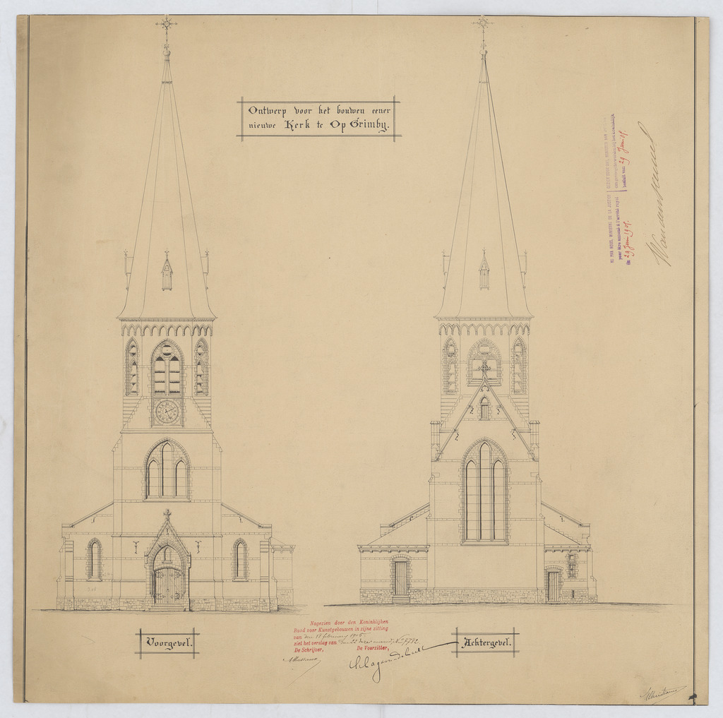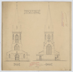 Opschrift: Ontwerp voor het bouwen eener nieuwe kerk te Opgrimby Omschrijving plan: opstand voorgevel, achtergevel Datum KCML: 18-2-1905 Archiefnummer: L0731