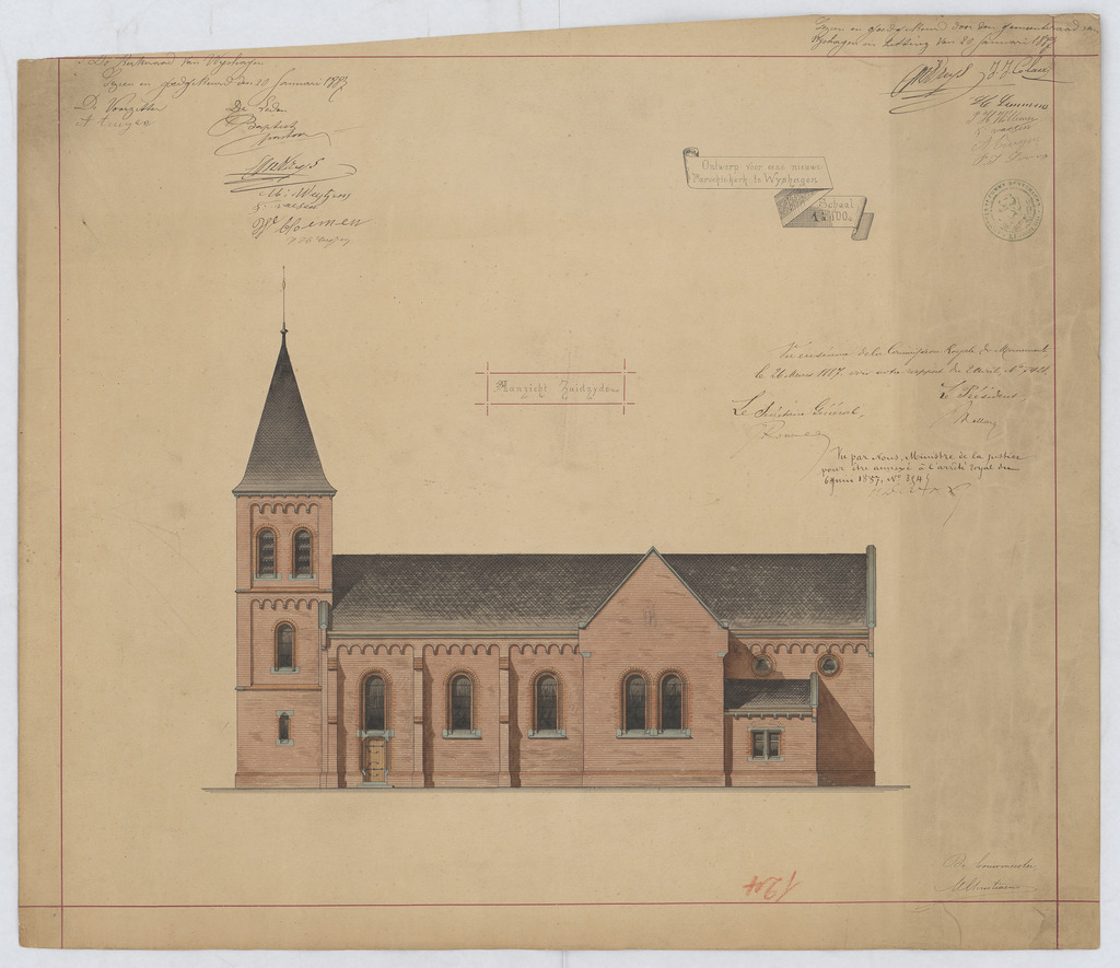 Opschrift: Ontwerp voor eene nieuwe parochiekerk te Wijshagen - aanzicht zuidzijde Omschrijving plan: opstand Z-gevel Datum KCML: 26/03/1887 Archiefnummer: L0745
