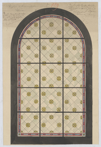 Opschrift: deze informatie wordt niet vermeld op het archiefstuk Omschrijving plan: ontwerp glasramen Datum KCML: 28/07/1888 Archiefnummer: L0778