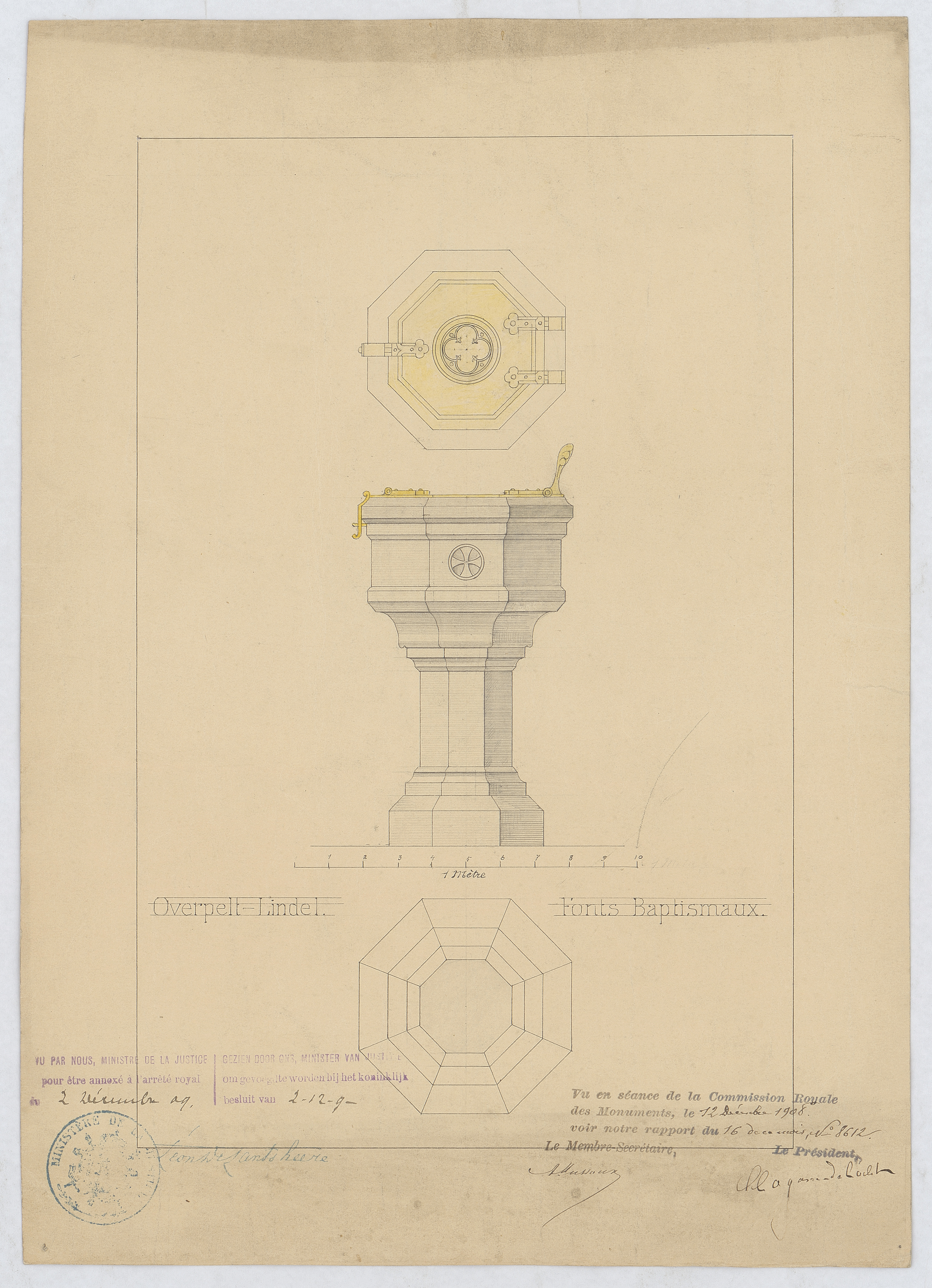 Opschrift: Fonts Baptismaux Omschrijving plan: ontwerp doopvont, plattegrond Datum KCML: 12-12-1908 Archiefnummer: L0799