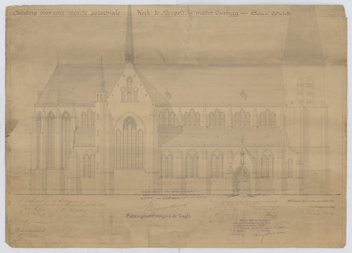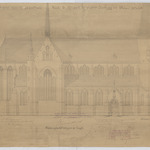 Opschrift: Ontwerp voor eene nieuwe parochiale kerk te Neerpelt - buitengezicht volgens de lengte Omschrijving plan: opstand zijgevel Datum KCML: 21/10/1898 Archiefnummer: L0753