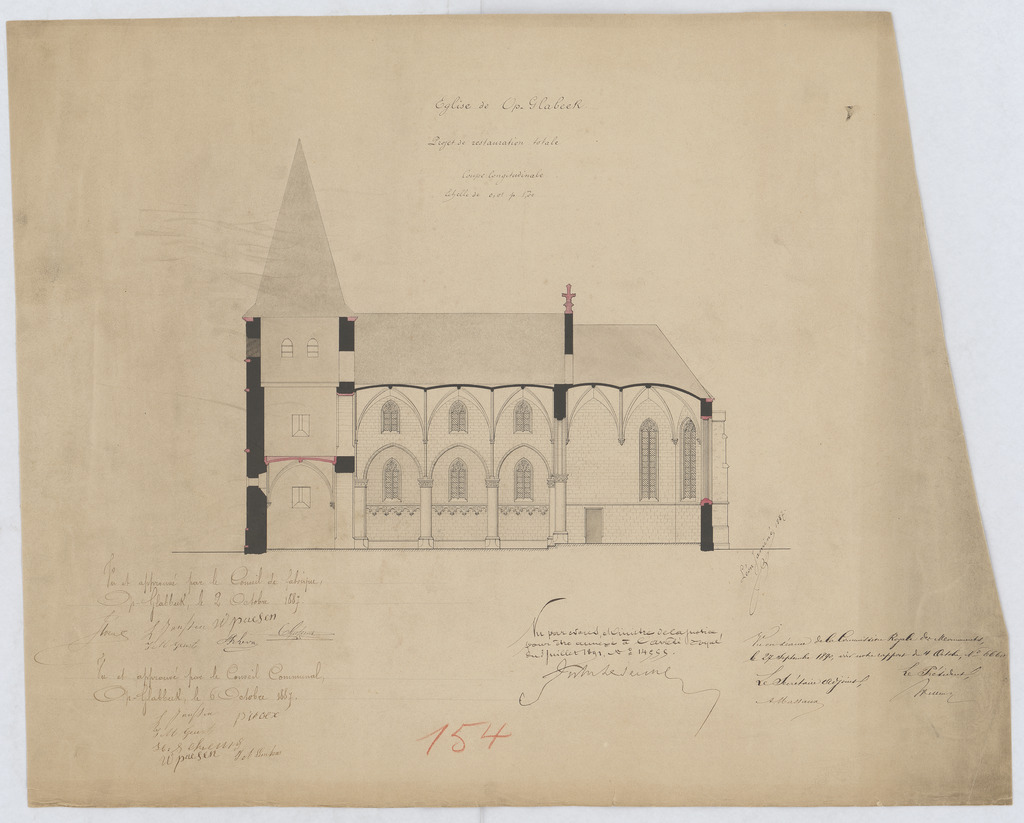 Opschrift: Projet de restauration totale - coupe longitudinale Omschrijving plan: langsdoorsnede Datum KCML: 27/09/1890 Archiefnummer: L0785