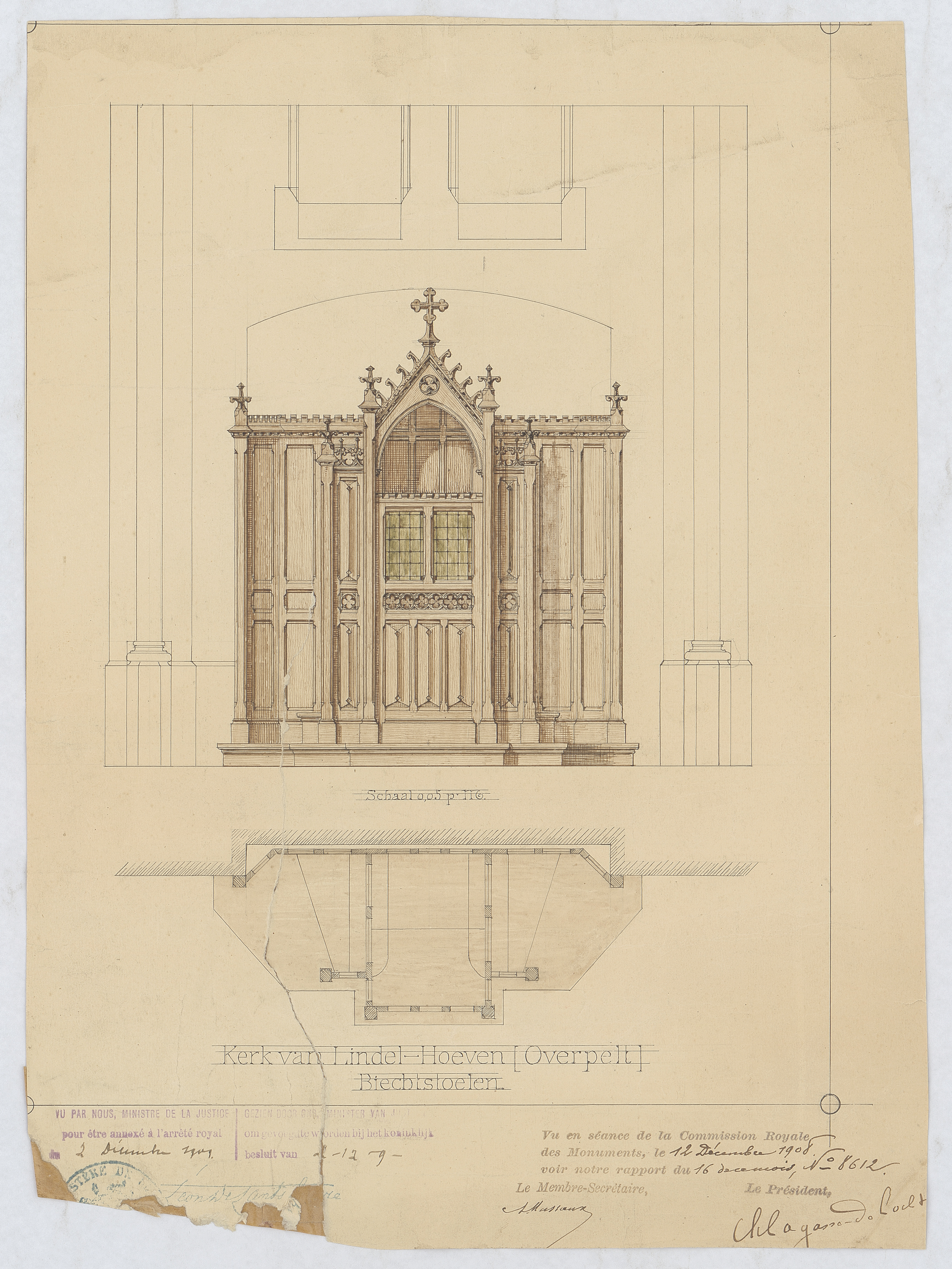 Opschrift: Biechtstoelen Omschrijving plan: opstand voorkant, plattegrond Datum KCML: 12-12-1908 Archiefnummer: L0793