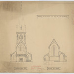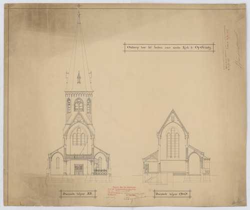 Opschrift: Ontwerp voor het bouwen eener nieuwe kerk te Opgrimby Omschrijving plan: dwarsdoorsneden, voorgevel, achtergevel Datum KCML: 18-2-1905 Archiefnummer: L0732
