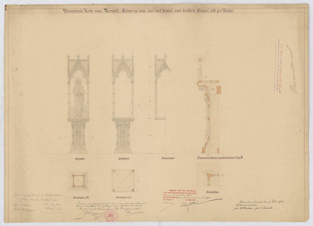 Opschrift: Parochiale kerk van Neerpelt ontwerp van voet met hemel voor beelden Omschrijving plan: ontwerp beelden Datum KCML: 22-10-1904 Archiefnummer: L0760