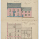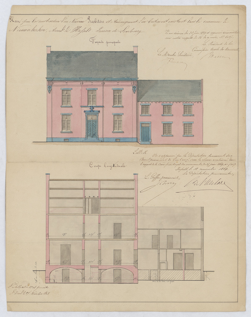 Opschrift: Plan pour la construction d'un nouveau presbytère et aménagement d'un bâtiment existant dans la commune de Nieuwekerken Omschrijving plan: opstand voorgevel, langsdoorsnede Datum KCML: 22/06/1869 Archiefnummer: L0774