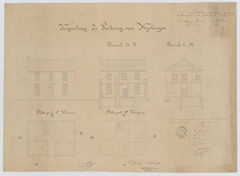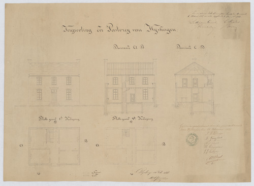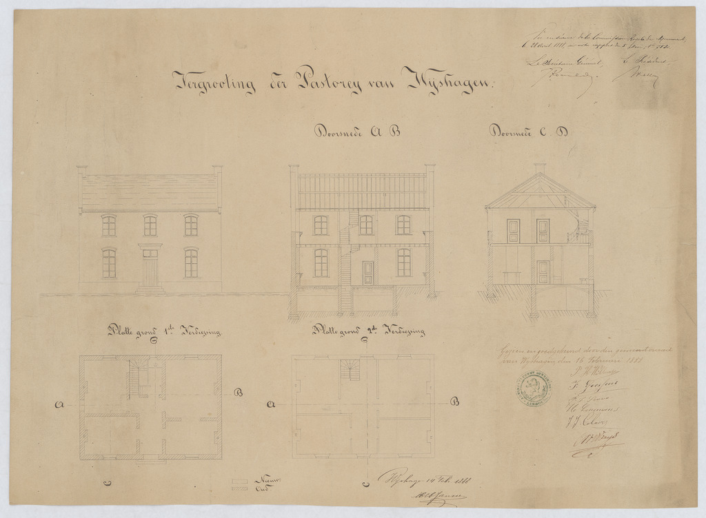 Opschrift: Vergrooting der pastorij van Wijshagen Omschrijving plan: opstand voorgevel, langsdoorsnede, dwarsdoorsnede, plattegrond niveau 0, plattegrond niveau 1 Datum KCML: 28/04/1888 Archiefnummer: L0741 Ontwerper: Janssen, voornaam onbekend