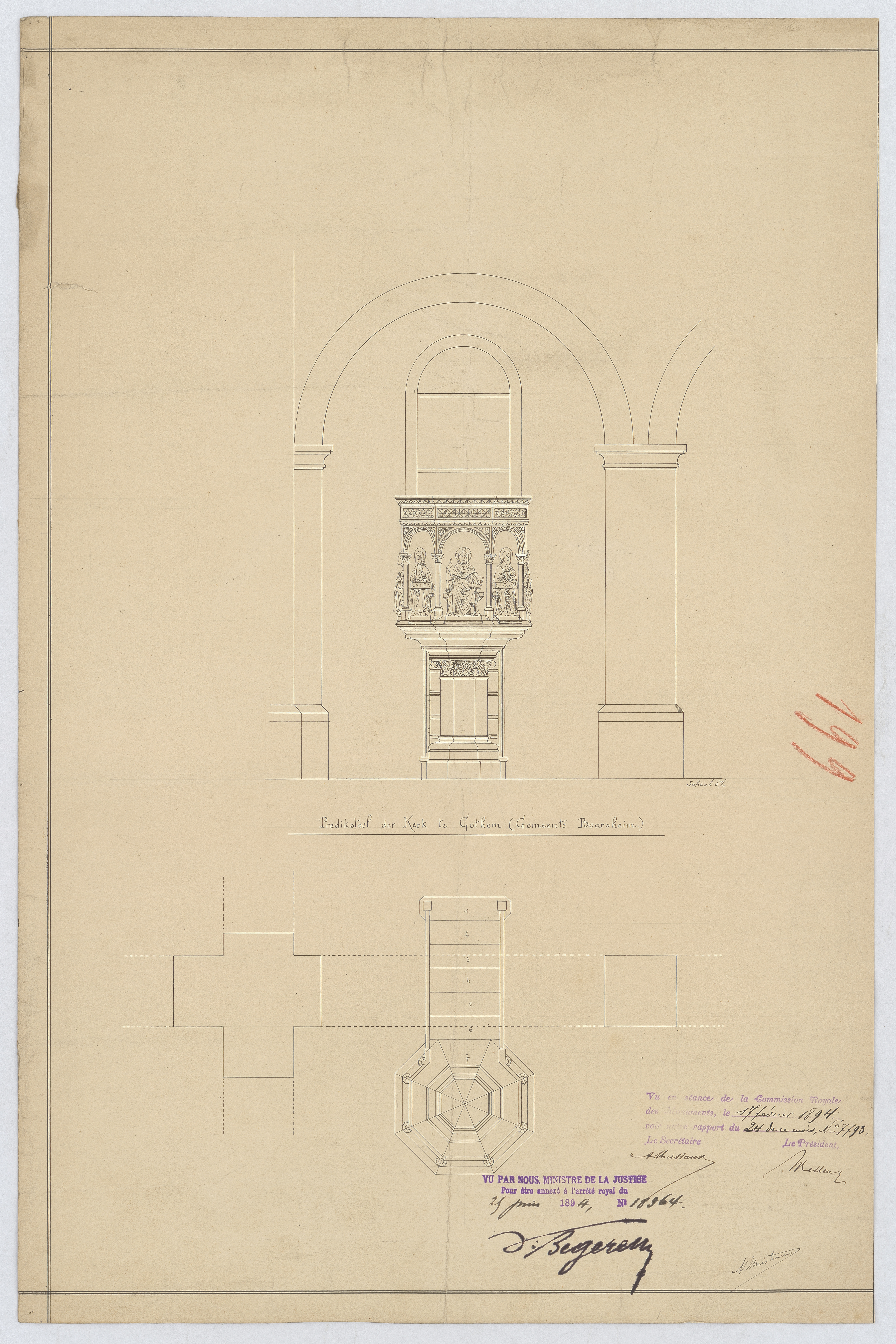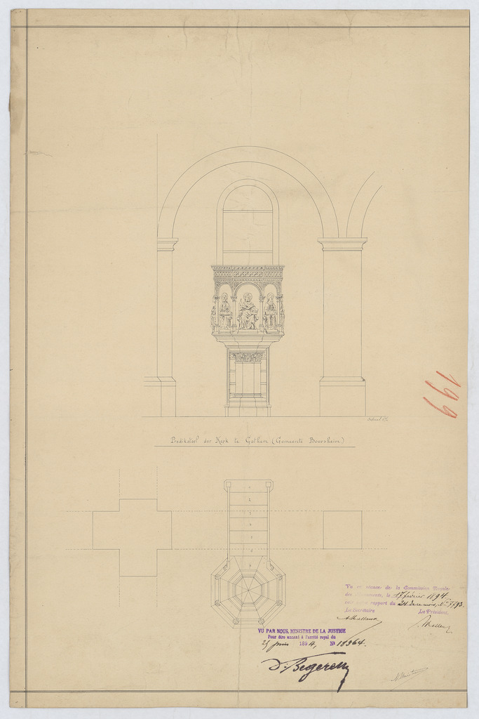 Opschrift: Predikstoel der kerk te Cothem (Gemeente Boorsheim) Omschrijving plan: ontwerp preekstoel, opstand grondplan Datum KCML: 17/02/1894 Archiefnummer: L0700