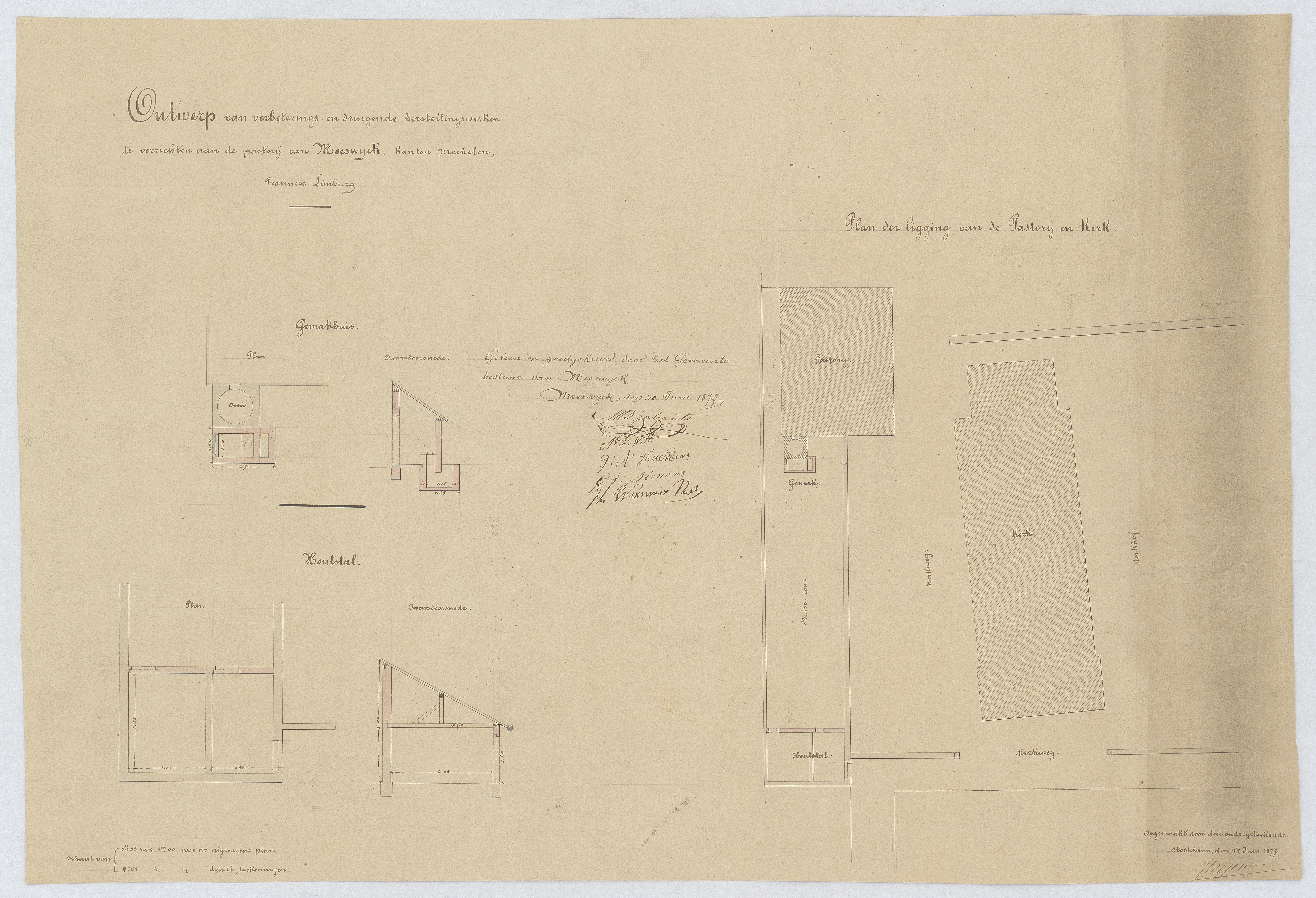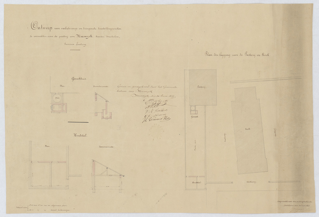 Opschrift: Ontwerp van verbeterings- en dringende herstellingswerken te verrichten aan de pastorij van Meeswijck Omschrijving plan: gemakshuis, houtstal, plan der ligging Datum KCML: deze informatie wordt niet vermeld op het archiefstuk Archiefnummer: L0723