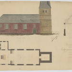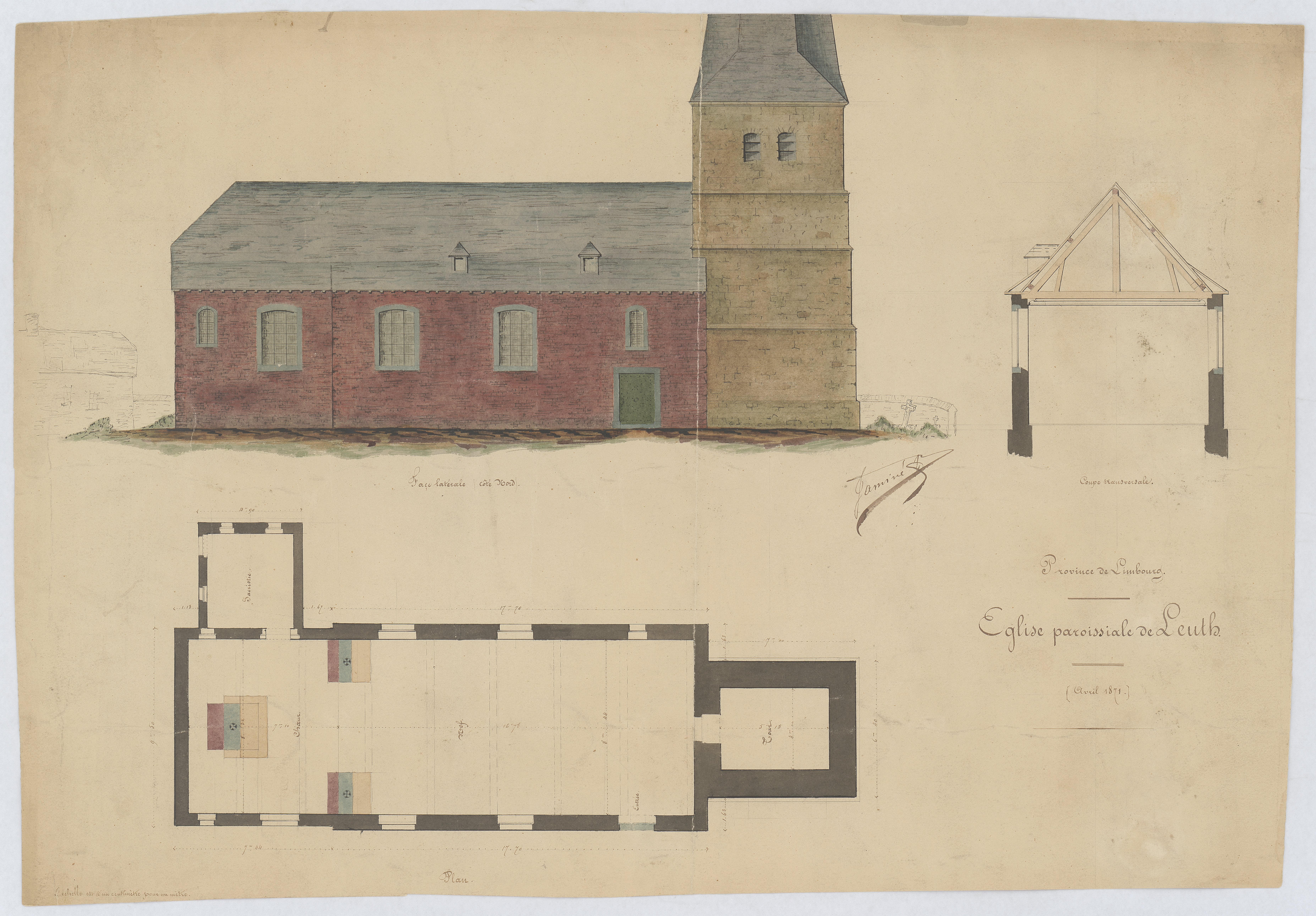 Opschrift: Église paroissiale de Leuth Omschrijving plan: opstand N-gevel, dwarsdoorsnede, plattegrond niveau 0 Datum KCML: deze informatie wordt niet vermeld op het archiefstuk Archiefnummer: L0717