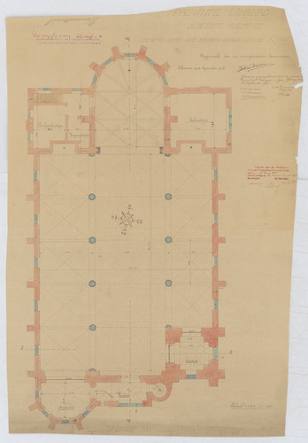 Opschrift: Gemeente Riempst ontwerp voor het bouwen eener nieuwe kerk grondplan Omschrijving plan: plattegrond niveau 0 Datum KCML: 23-7-1906 Archiefnummer: L0848