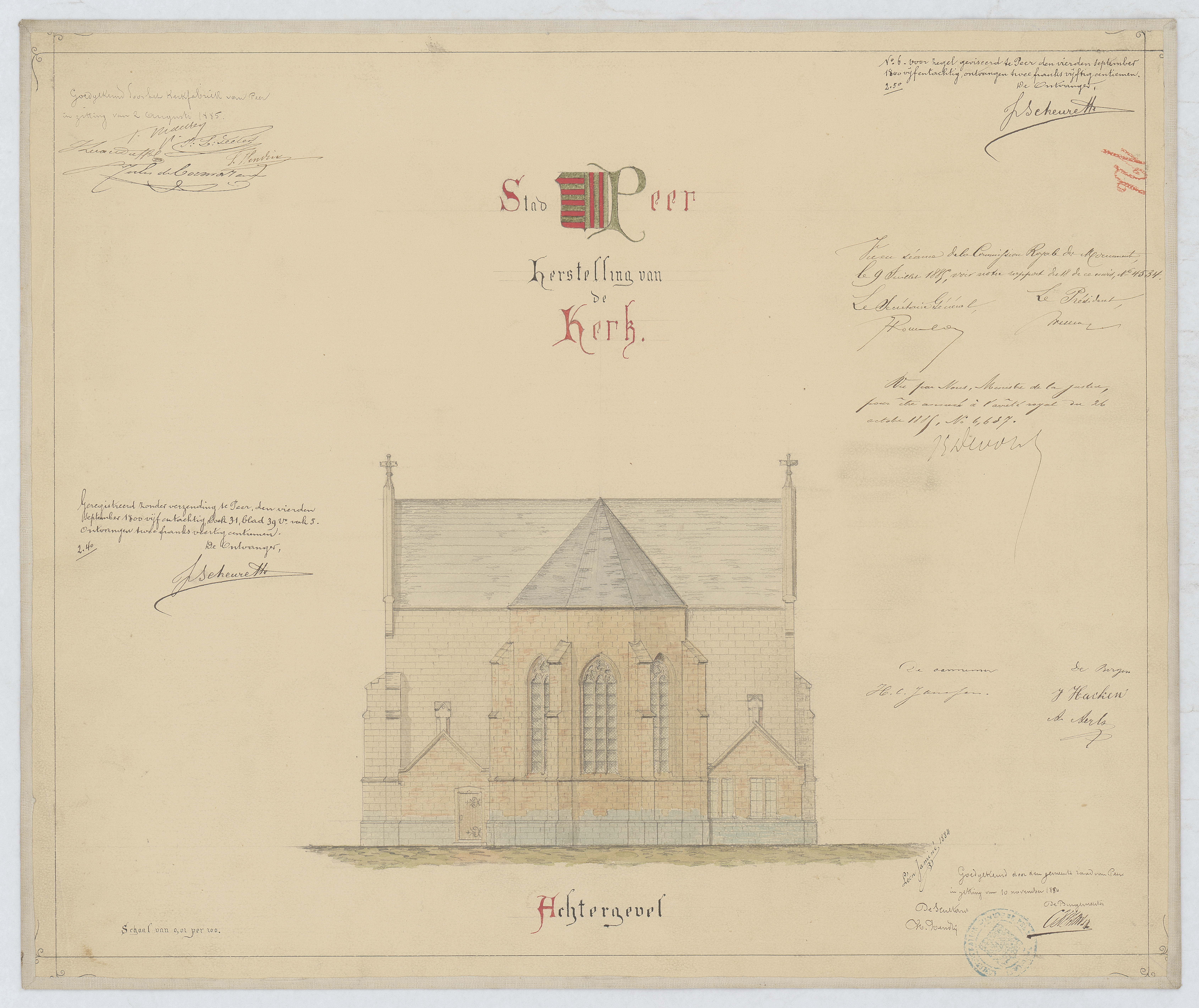 Opschrift: Herstellingen van de kerk Stad Peer, achtergevel Omschrijving plan: opstand achtergevel Datum KCML: 09/07/1885 Archiefnummer: L0814