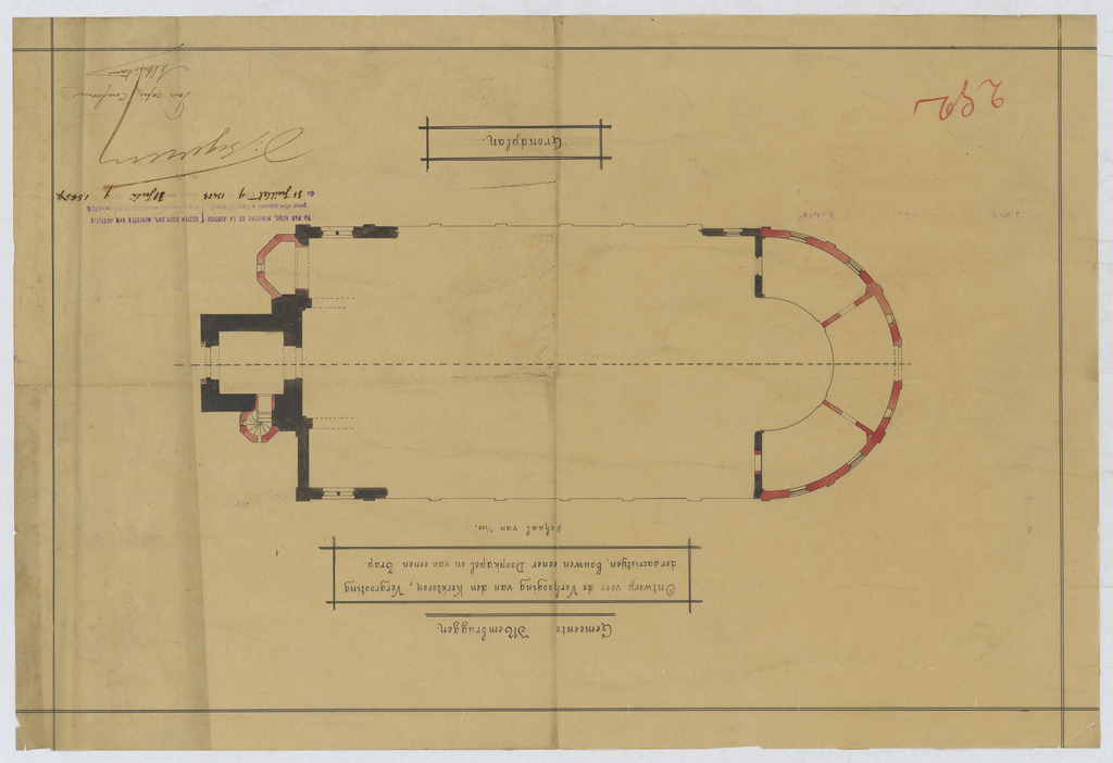 Opschrift: Ontwerp voor de verhooging van den kerktoren, vergrootingen der sacristijen, bouwen eener Doopkapel en van eenen Trap, grondplan Omschrijving plan: plattegrond niveau 0 Datum KCML: deze informatie wordt niet vermeld op het archiefstuk Archiefnummer: L0850