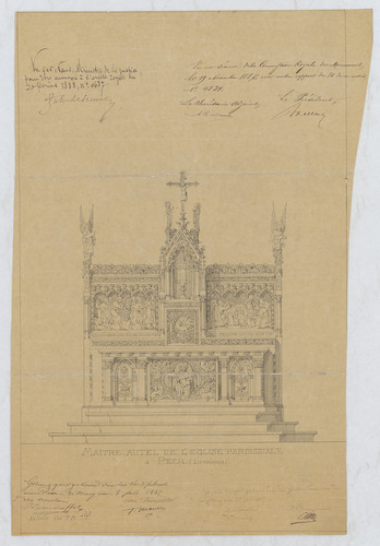 Opschrift: Maître autel de l'église paroissiale à Peer Omschrijving plan: ontwerp hoogaltaar Datum KCML: 19/11/1887 Archiefnummer: L0808