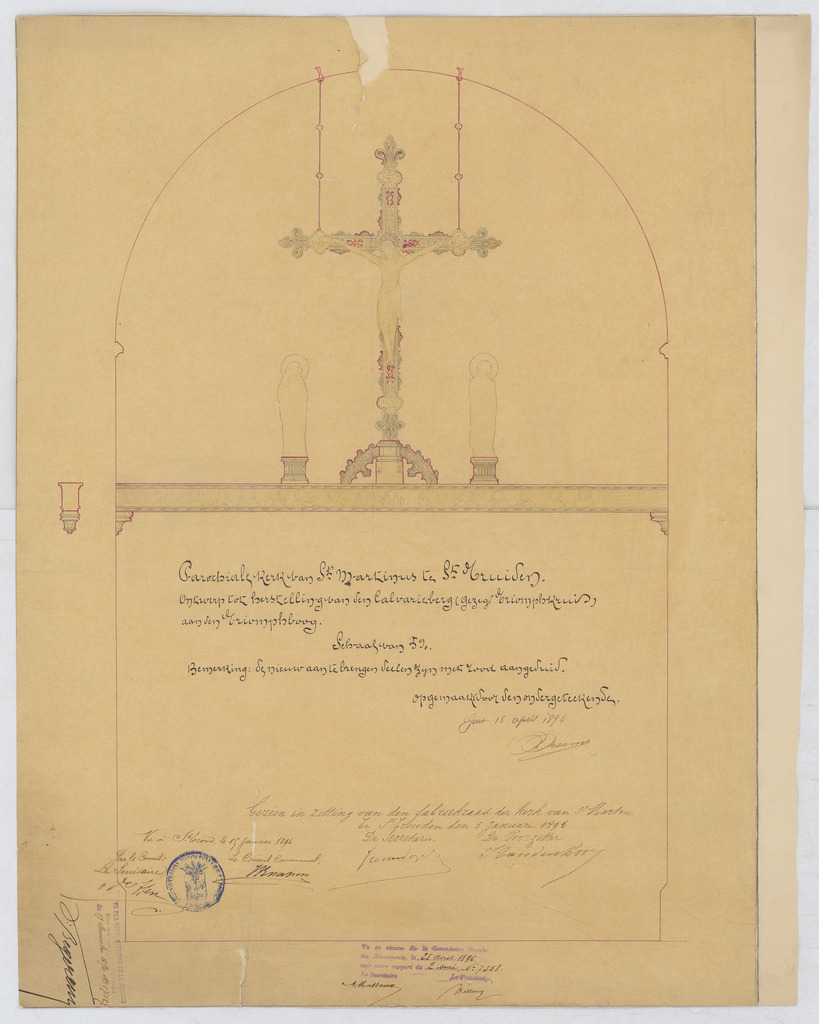 Opschrift: Ontwerp tot herstelling van den Calvarieberg gezegd triompfkruis aan den triomphboog Omschrijving plan: ontwerp triomfkruis Datum KCML: 25/04/1896 Archiefnummer: L0890