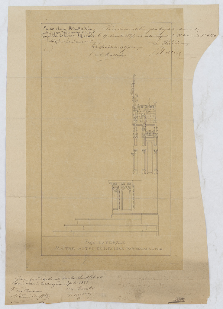 Opschrift: Face latérale maître autel de l'église paroissiale Omschrijving plan: ontwerp altaar Datum KCML: 19/11/1887 Archiefnummer: L0811