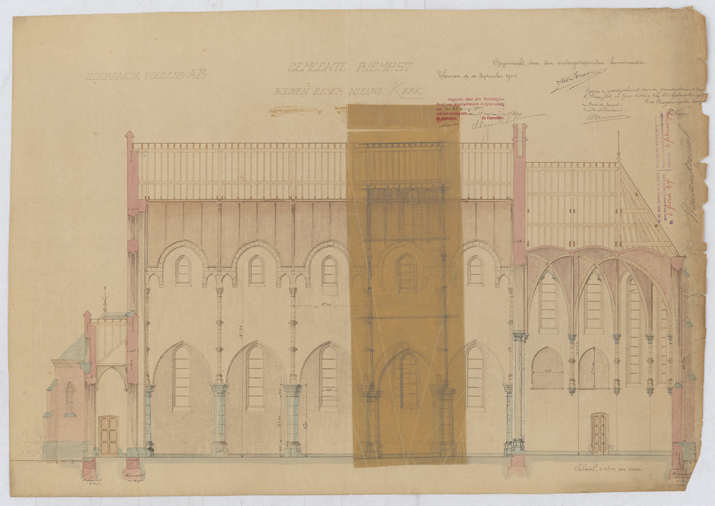 Opschrift: Gemeente Riempst bouwen eener nieuwe kerk doorsnede AB Omschrijving plan: opstand O-gevel Datum KCML: 23-7-1906 Archiefnummer: L0847