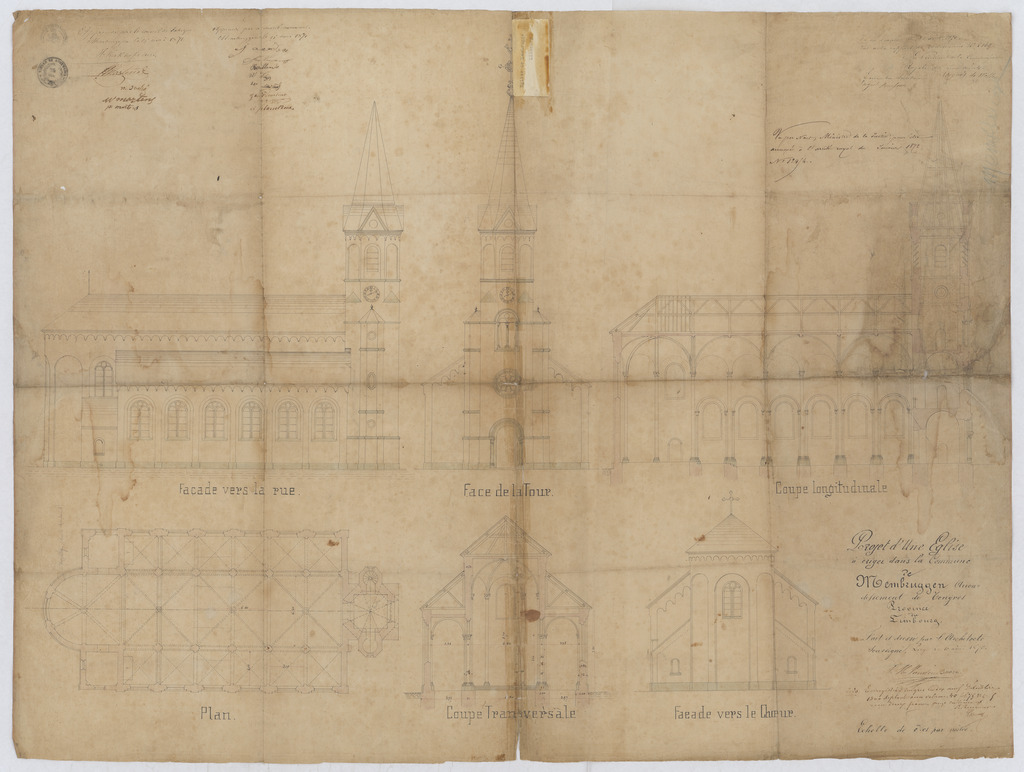 Opschrift: Ontwerp voor de bouw van een nieuwe kerk Omschrijving plan: opstand N-gevel, opstand Z-gevel, opstand W-gevel, langsdoorsnede, plattegrond, dwarsdoorsnede, opstand O-gevel Datum KCML: 13/08/1870 Archiefnummer: L0851 Ontwerper: Van Den Booren, voornaam onbekend