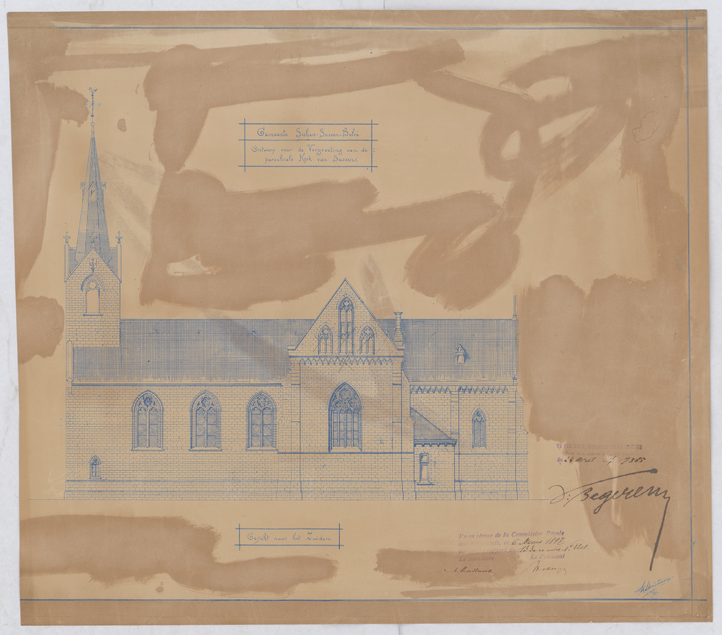 Opschrift: Ontwerp voor de vergrooting van de parochiale kerk van Sussen gezicht naar het Zuiden Omschrijving plan: opstand Z-gevel Datum KCML: 06/03/1897 Archiefnummer: L0876