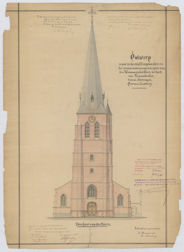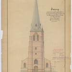 Opschrift: Ontwerp voor de herstellingswerken en het vernieuwen van het spits van den monumentalen toren der kerk van Tessenderloo - Voorkant van den toren Omschrijving plan: opstand voorgevel Datum KCML: 03/09/1898 Archiefnummer: L0994