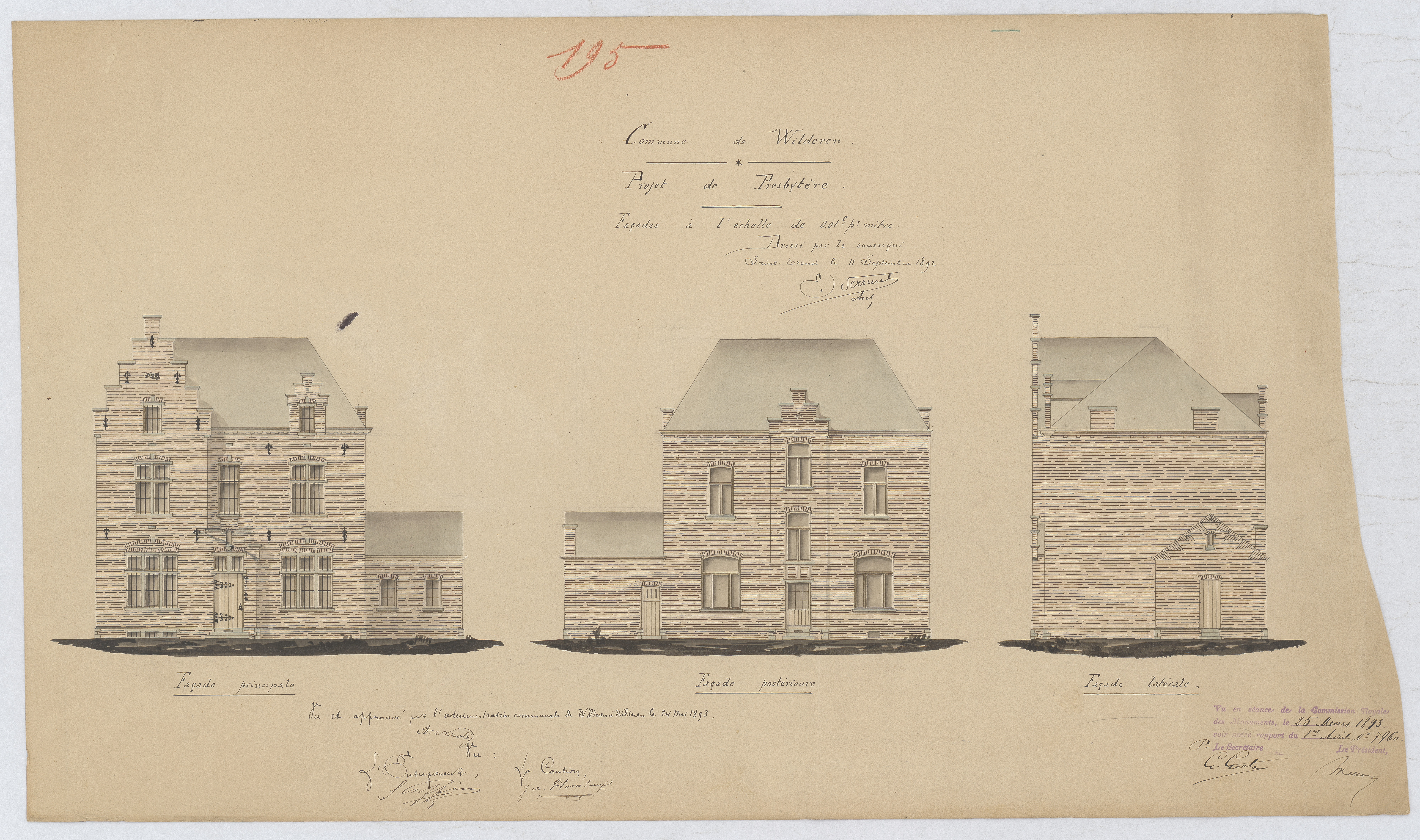 Opschrift: Commune de Wilderen; projet de presbytère façade Omschrijving plan: opstanden, voorgevel, achtergevel, zijgevel Datum KCML: 25/03/1893 Archiefnummer: L0970