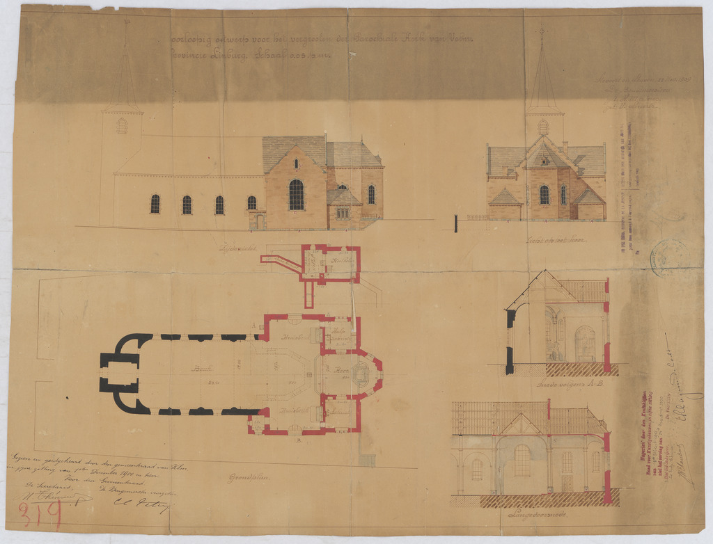 Opschrift: Voorlopig ontwerp voor het vergrooten der parochiale kerk van Velm Omschrijving plan: opstand Z-gevel, plattegrond niveau 0, opstand O-gevel, dwarsdoorsnede naar het koor, langsdoorsnede Datum KCML: 18-3-1911 Archiefnummer: L0969
