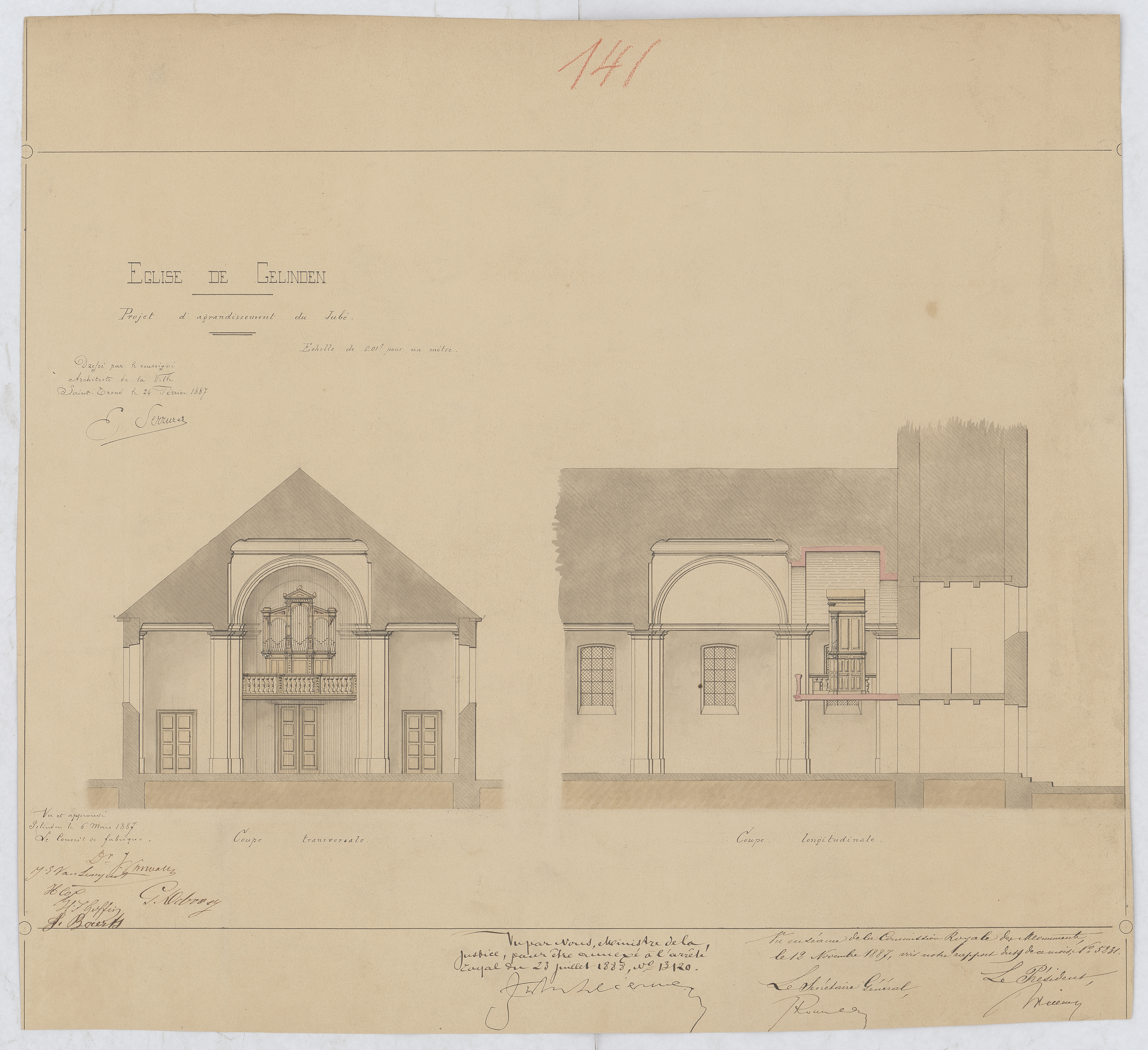 Opschrift: Projet d'agrandissement de Jubé Omschrijving plan: dwarsdoorsnede, langsdoorsnede Datum KCML: 12/11/1887 Archiefnummer: L0903