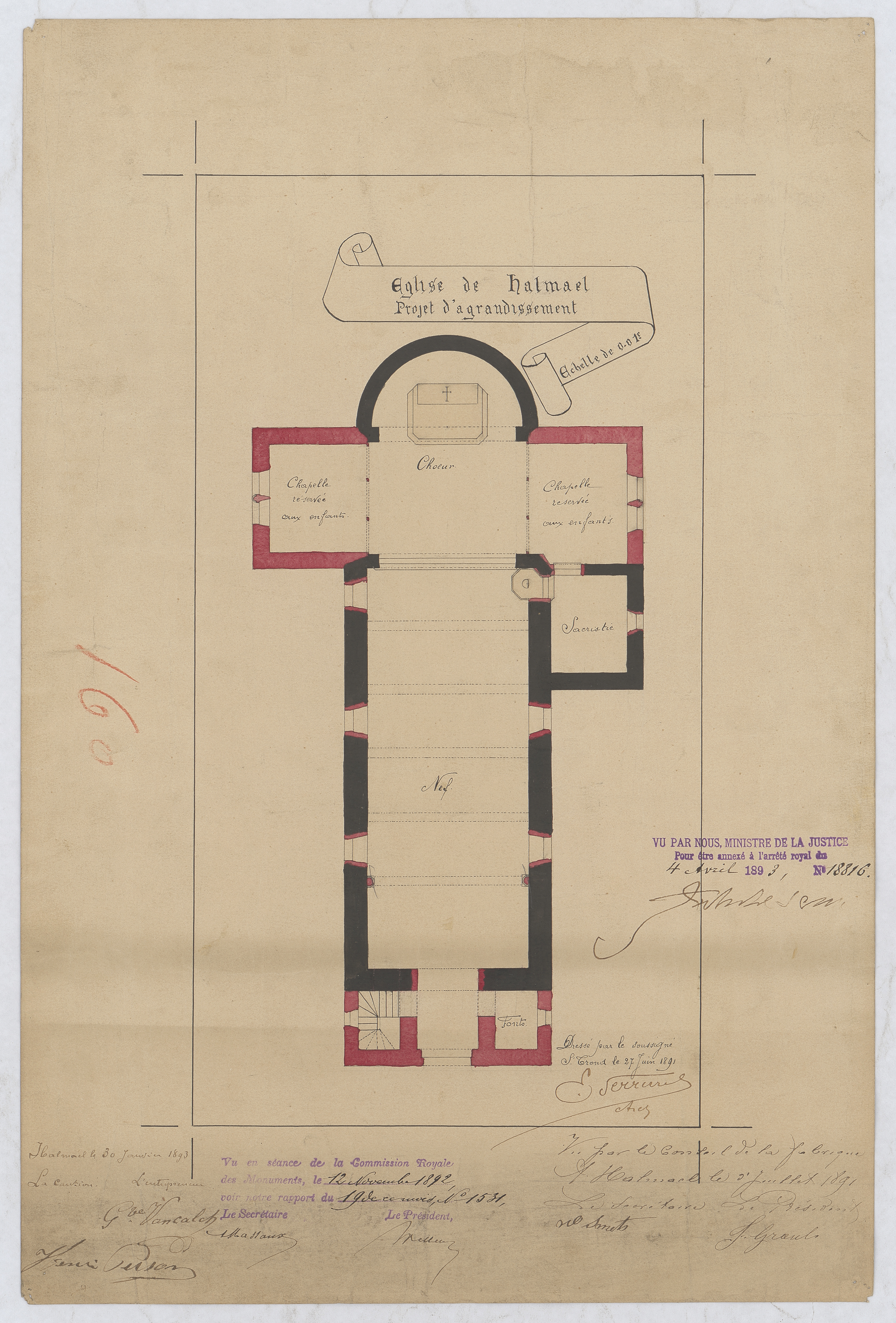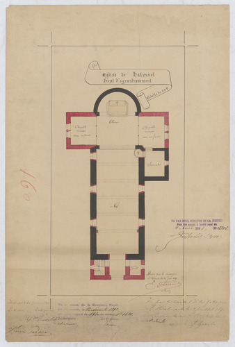Opschrift: Église de Halmael projet d'agrandissement Omschrijving plan: plattegrond niveau 0 Datum KCML: 12/11/1892 Archiefnummer: L0926