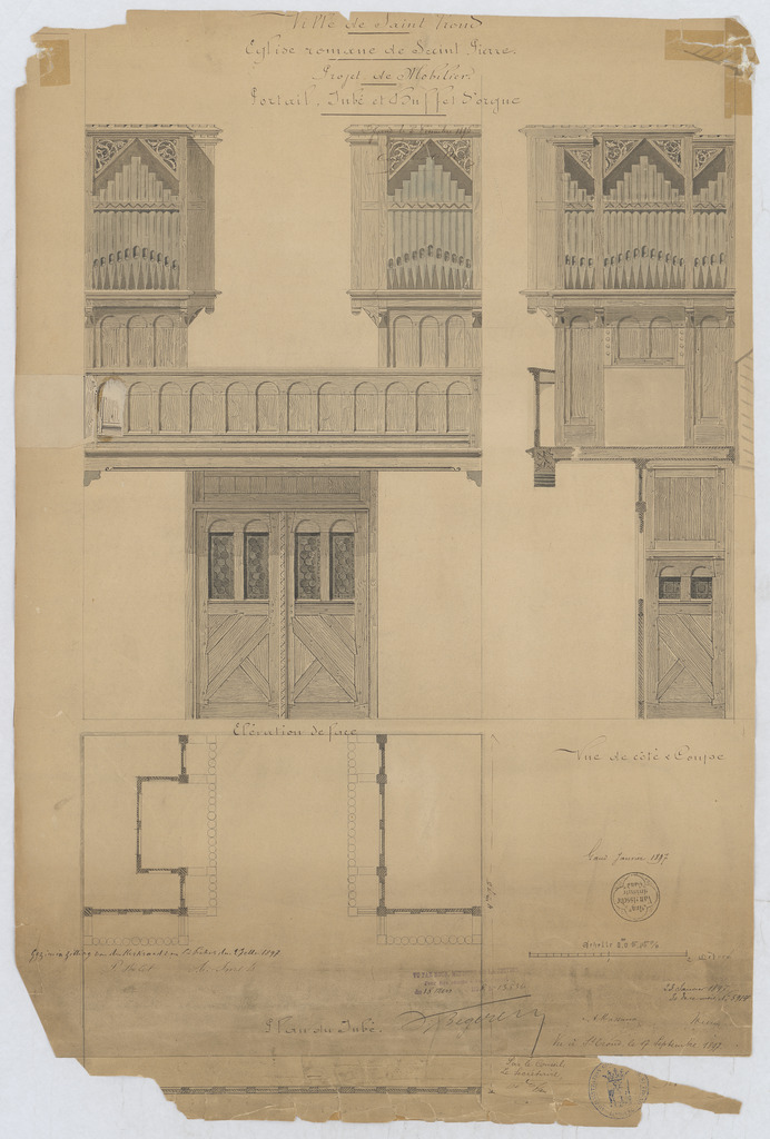 Opschrift: Projet de mobilier; portail, jubé et buffet d'orgue Omschrijving plan: ontwerp orgelkast en portaal onderdoksaal Datum KCML: 23/01/1897 Archiefnummer: L0937