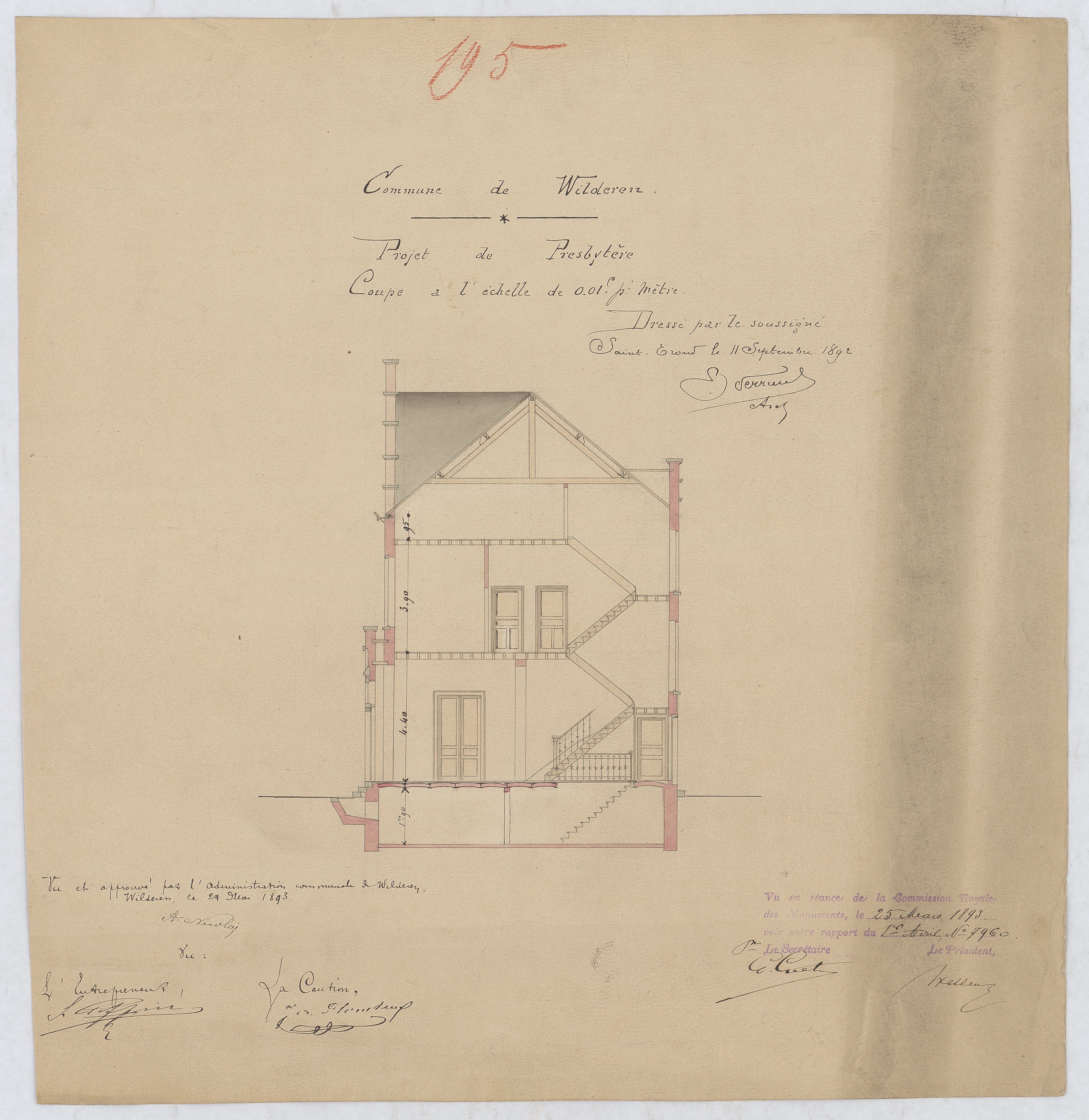Opschrift: Commune de Wilderen; projet de presbytère coupe Omschrijving plan: dwarsdoorsnede Datum KCML: 25/03/1893 Archiefnummer: L0972