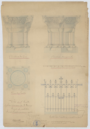 Opschrift: Projet de mobilier fonts baptismaux et grille Omschrijving plan: ontwerp doopvont en doopkapel Datum KCML: 23/01/1897 Archiefnummer: L0939