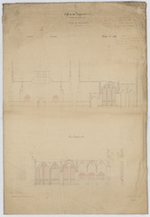 Opschrift: Église de Zepperen projet de restauration Omschrijving plan: opstand W-gevel, dwarsdoorsnede naar het koor, langsdoorsnede Datum KCML: 06/07/1859 Archiefnummer: L0982