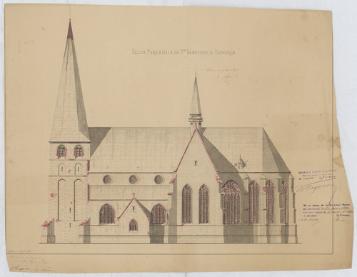 Opschrift: Église paroissiale de St. Genevieve a Zepperen Omschrijving plan: opstand zijgevel Datum KCML: 31/03/1894 Archiefnummer: L0975