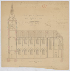 Opschrift: Projet pour la construction d'une église à Teuven - Coupe longitudinale Omschrijving plan: langsdoorsnede Datum KCML: 22/07/1871 Archiefnummer: L1101