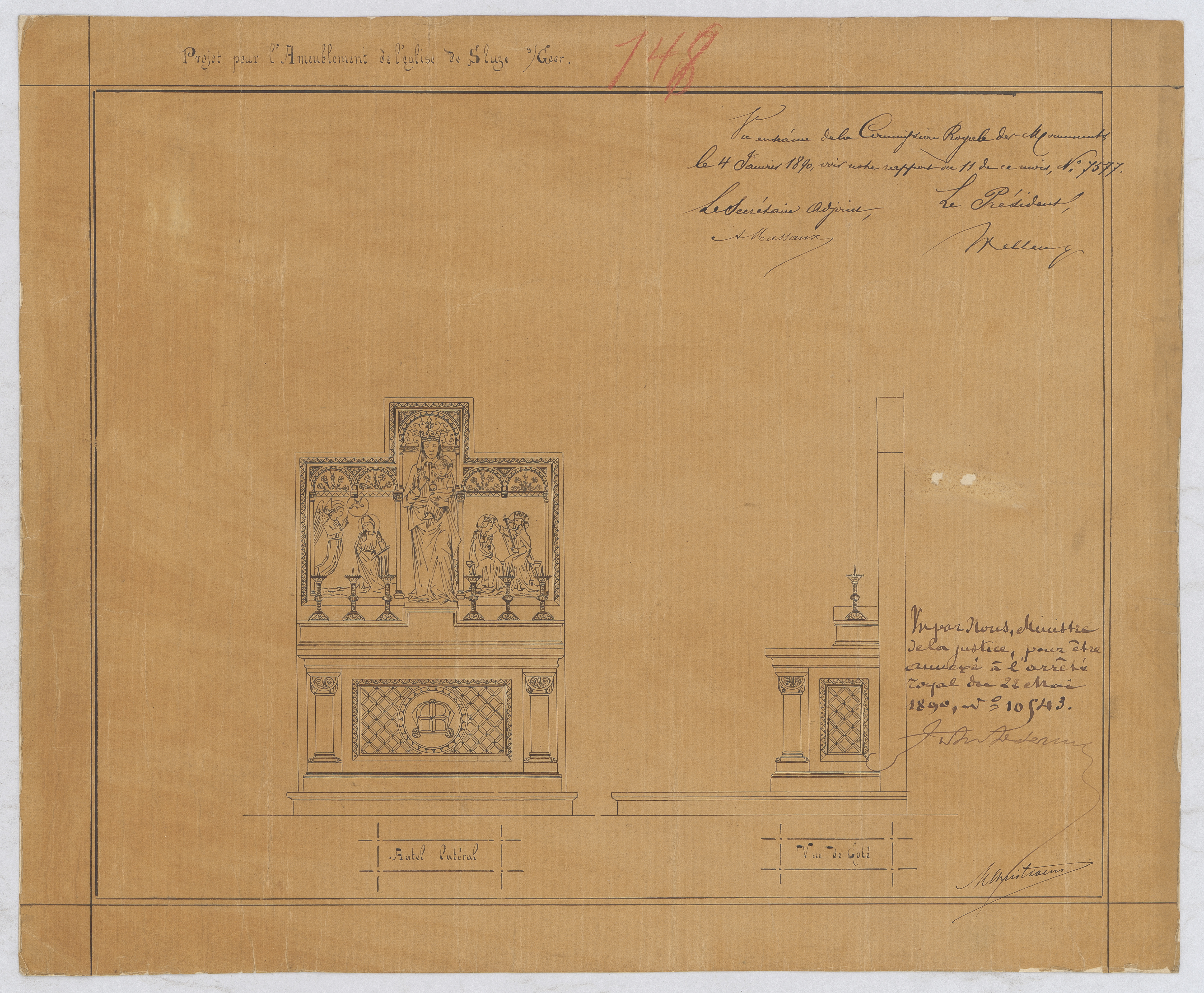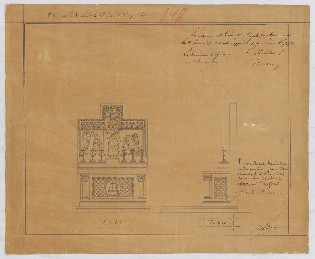 Opschrift: Projet pour l'ameublement de l'église de Sluze - Autel latéral Omschrijving plan: ontwerp altaar Datum KCML: 04/01/1890 Archiefnummer: L1090