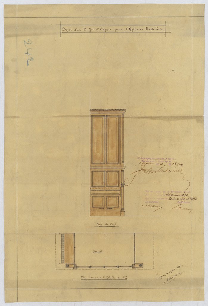 Opschrift: Projet d'un buffet d'orgues - Vue de côté / plan terrier Omschrijving plan: ontwerp orgel Datum KCML: 13/08/1892 Archiefnummer: L1076