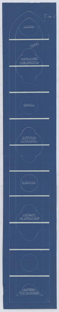 Opschrift: deze informatie wordt niet vermeld op het archiefstuk Omschrijving plan: ontwerp glasraam 'Lucas' Datum KCML: deze informatie wordt niet vermeld op het archiefstuk Archiefnummer: L1119