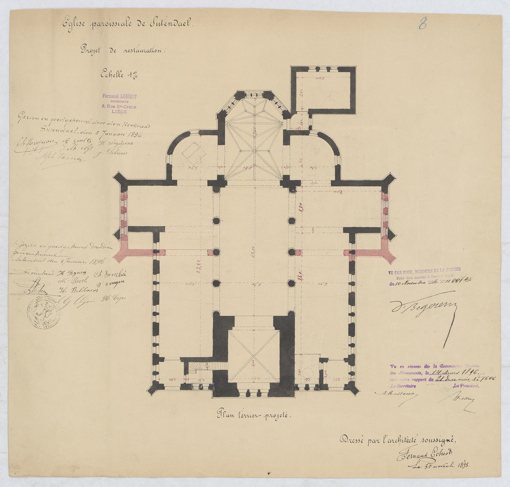 Opschrift: Église Paroissiale de Sutendael. projet de restauration Omschrijving plan: plattegrond niveau 0 Datum KCML: 14/03/1896 Archiefnummer: L1103