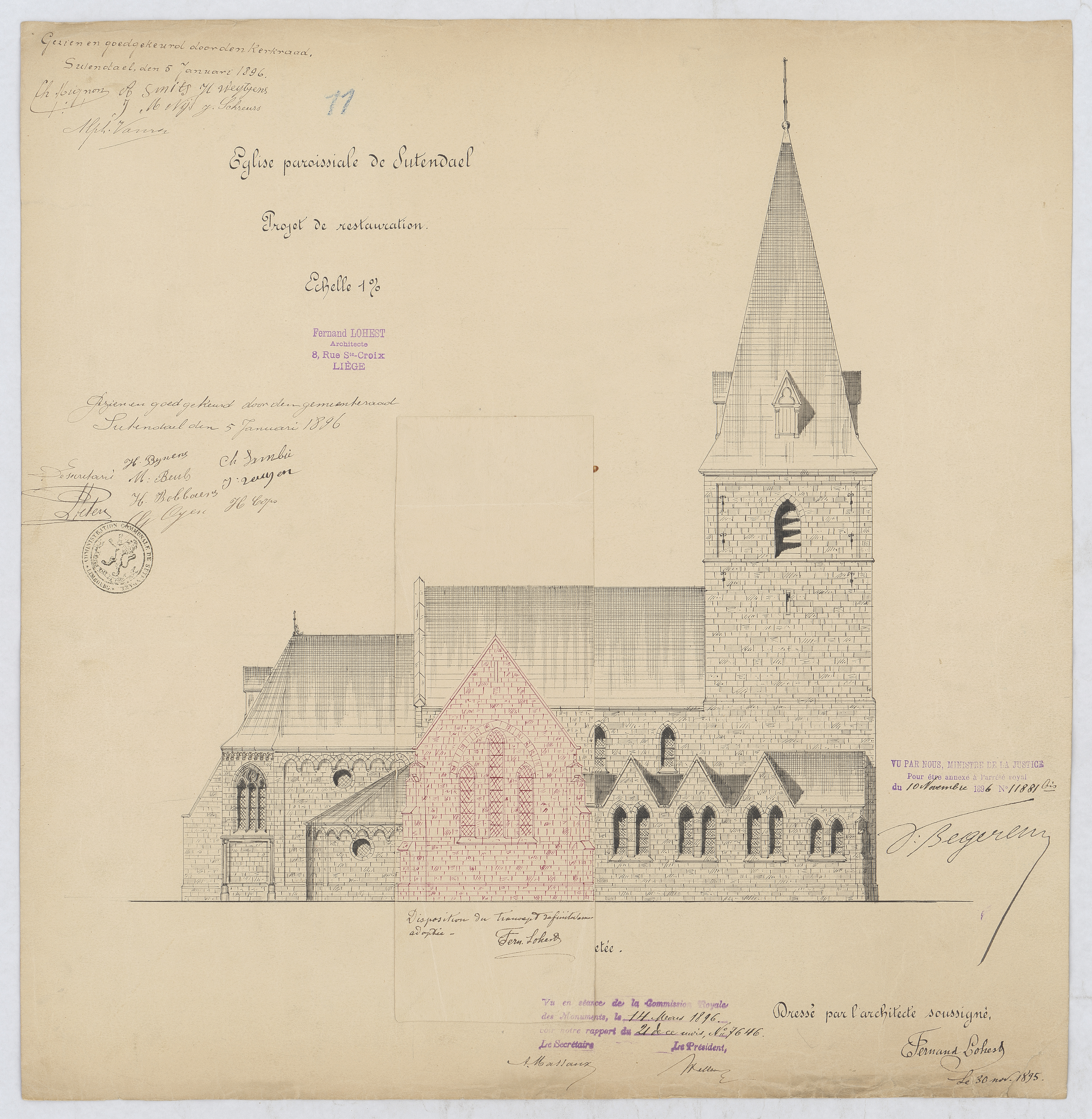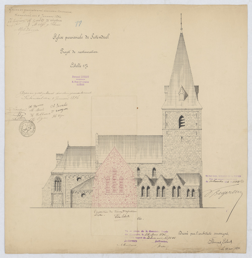 Opschrift: Église Paroissiale de Sutendael. projet de restauration Omschrijving plan: opstand N-gevel Datum KCML: 14/03/1896 Archiefnummer: L1105