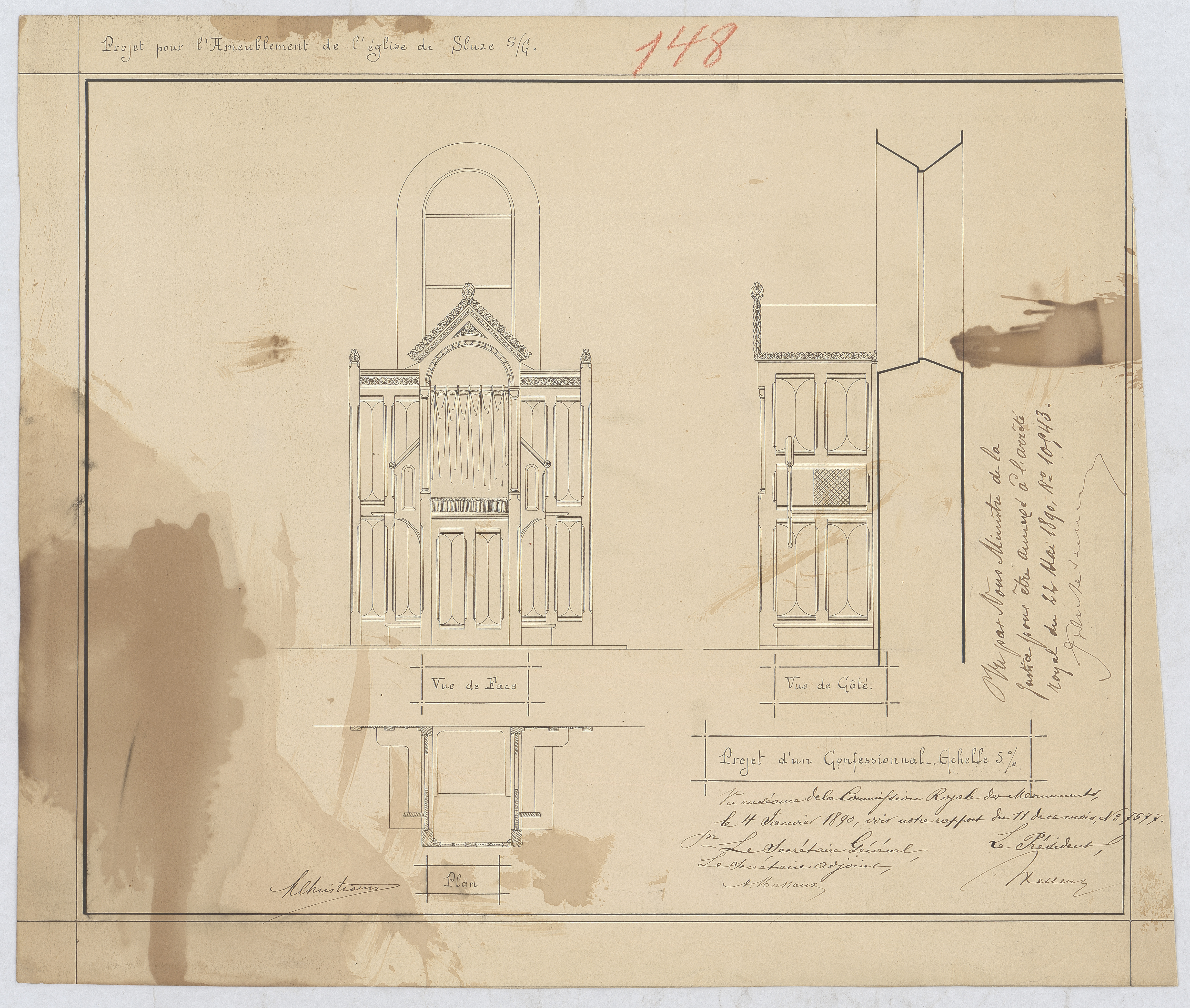 Opschrift: Projet pour l'ameublement de l'église de Sluze - Projet d'un confessionnal Omschrijving plan: ontwerp biechtstoel Datum KCML: 04/01/1890 Archiefnummer: L1088