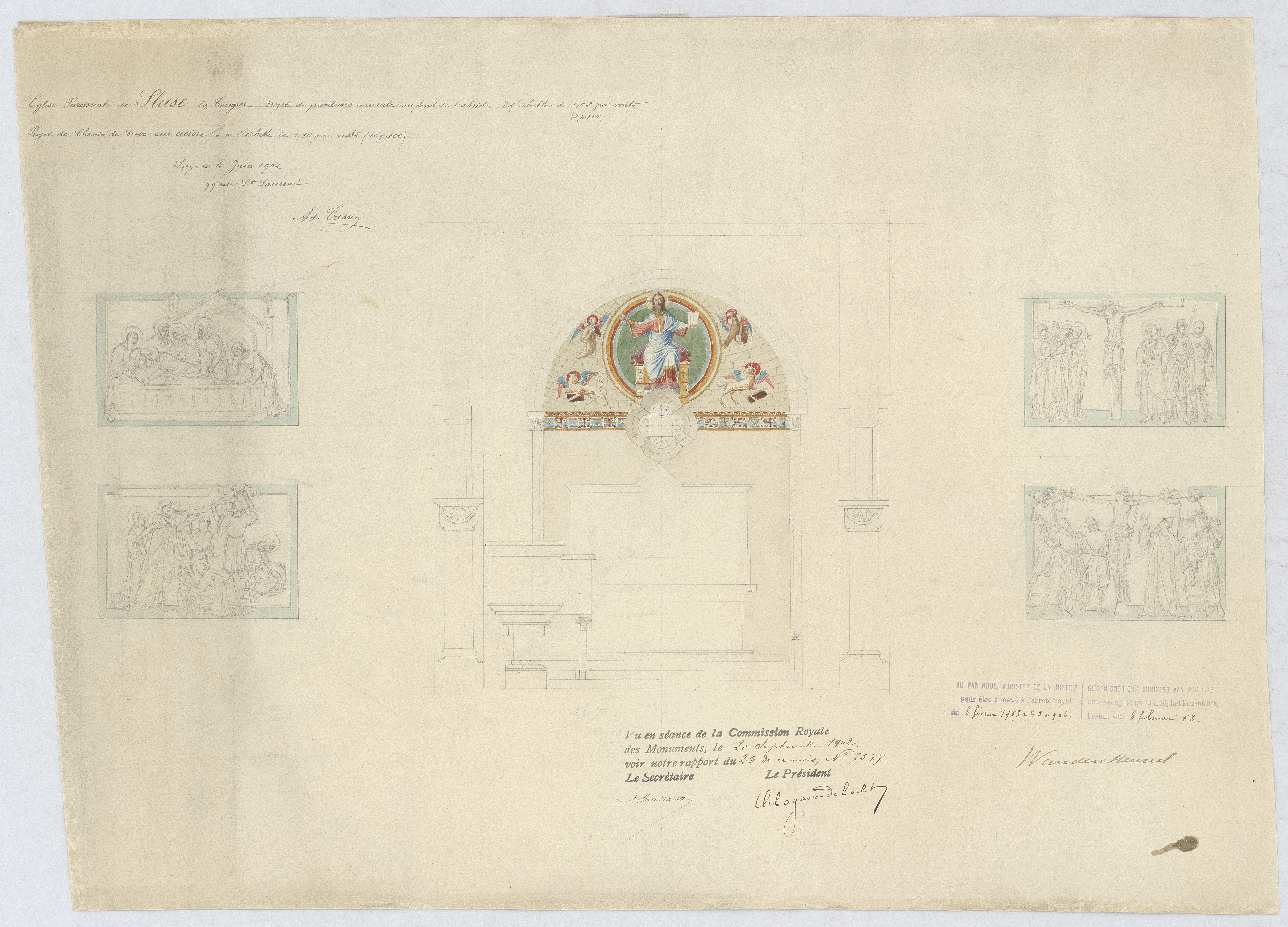 Opschrift: Projet de peintures murale au fond de l'abside / Projet de chemin de croix sur cuivre Omschrijving plan: ontwerp muraal Datum KCML: 20-9-1902 Archiefnummer: L1094