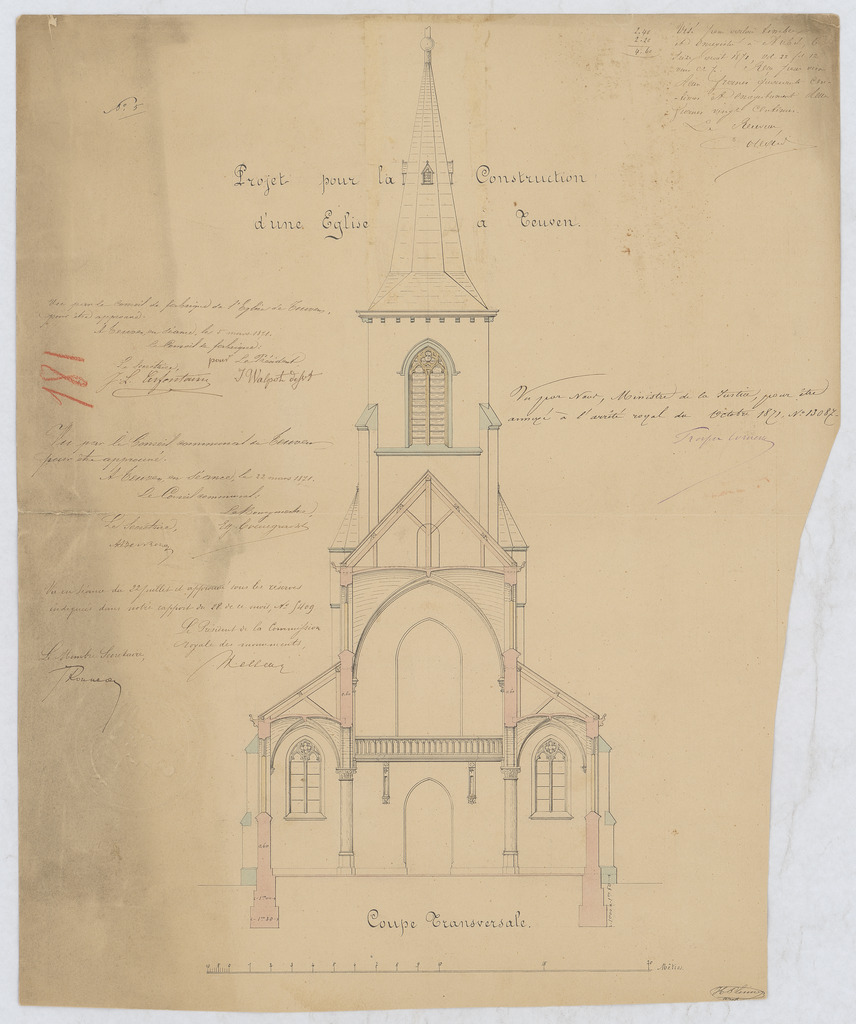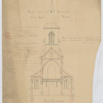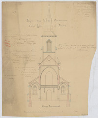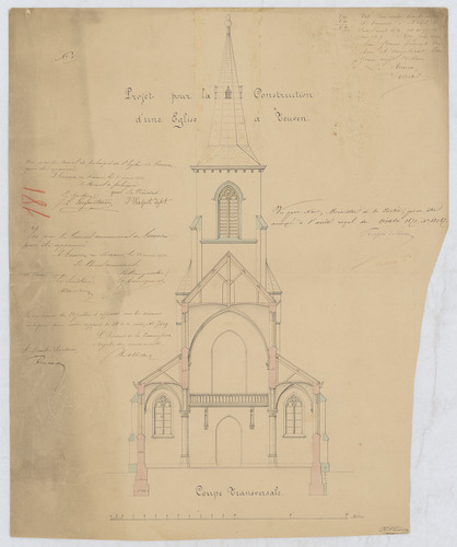 Opschrift: Projet pour la construction d'une église à Teuven - Coupe transversale Omschrijving plan: dwarsdoorsnede Datum KCML: 22/07/1871 Archiefnummer: L1098