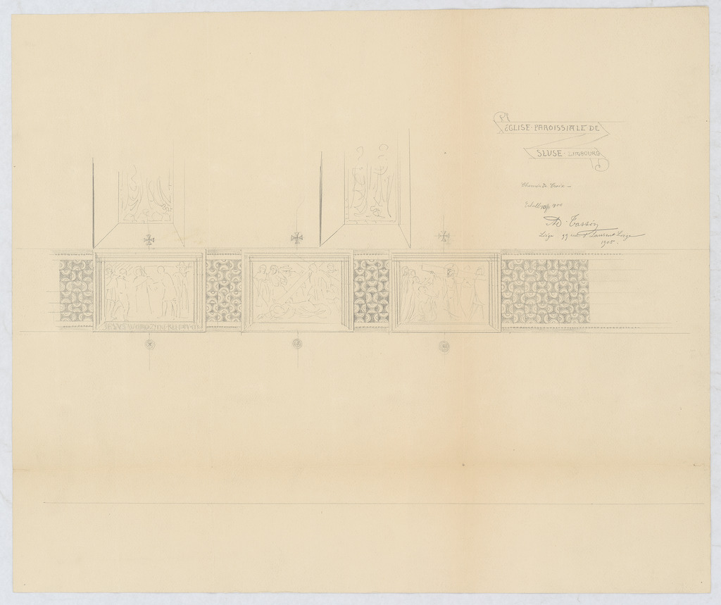 Opschrift: Chemin de croix Omschrijving plan: ontwerp wandschildering Datum KCML: deze informatie wordt niet vermeld op het archiefstuk Archiefnummer: L1095
