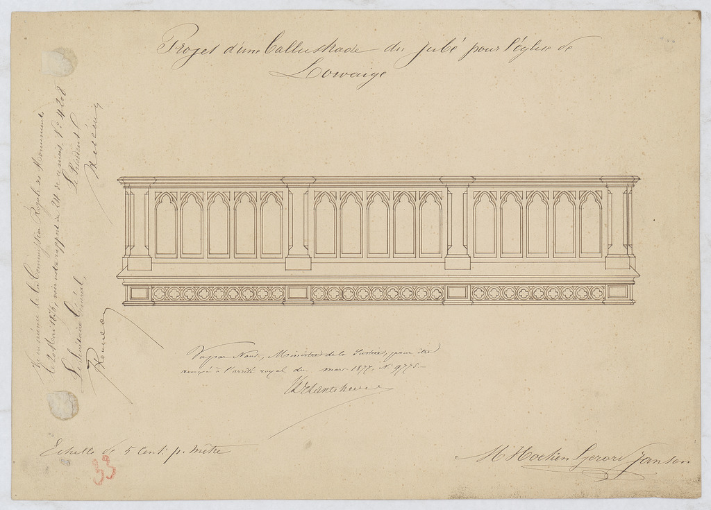 Opschrift: Projet d'une ballustrade du jubé pour l'église de Lowaige Omschrijving plan: ontwerp ballustrade van koordoksaal Datum KCML: 20/05/1876 Archiefnummer: L1047