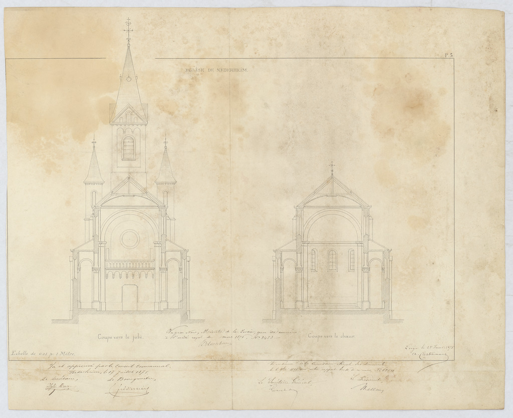 Opschrift: Église de Nederheim - Coupe vers le jubé / chœur Omschrijving plan: dwarsdoorsneden Datum KCML: 06/09/1875 Archiefnummer: L1069