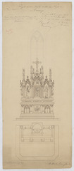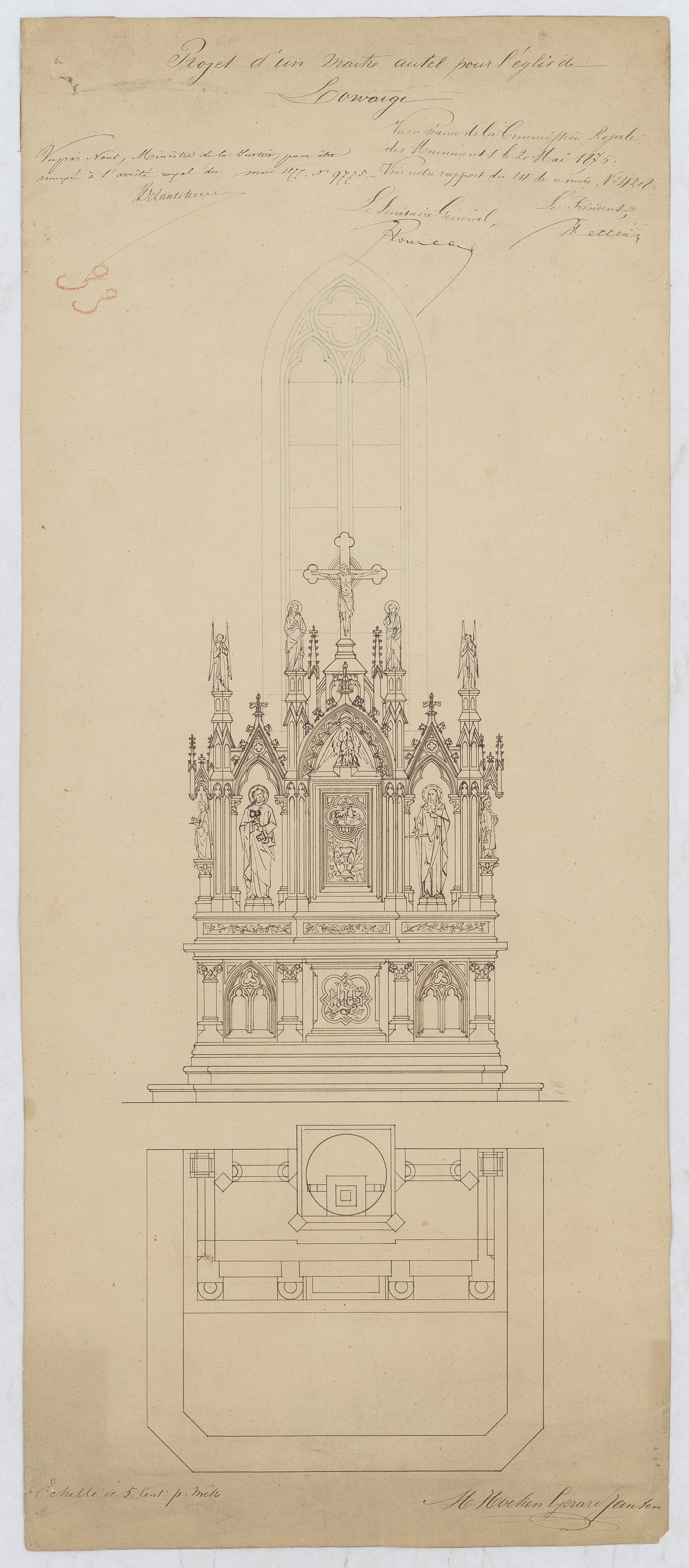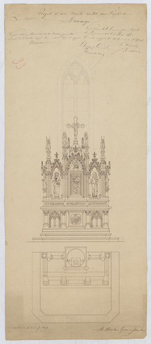 Opschrift: Projet d'un maître autel pour l'église Lowaige Omschrijving plan: hoogaltaar, opstand, grondplan Datum KCML: 20/05/1876 Archiefnummer: L1043