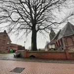 Opgaande bruine beuk als vredesboom. De muur is aangepast om de boomwortels ruimte te geven, op vandaag blijkt deze uitsparing niet meer voldoende en duwt de boom de muur weg.