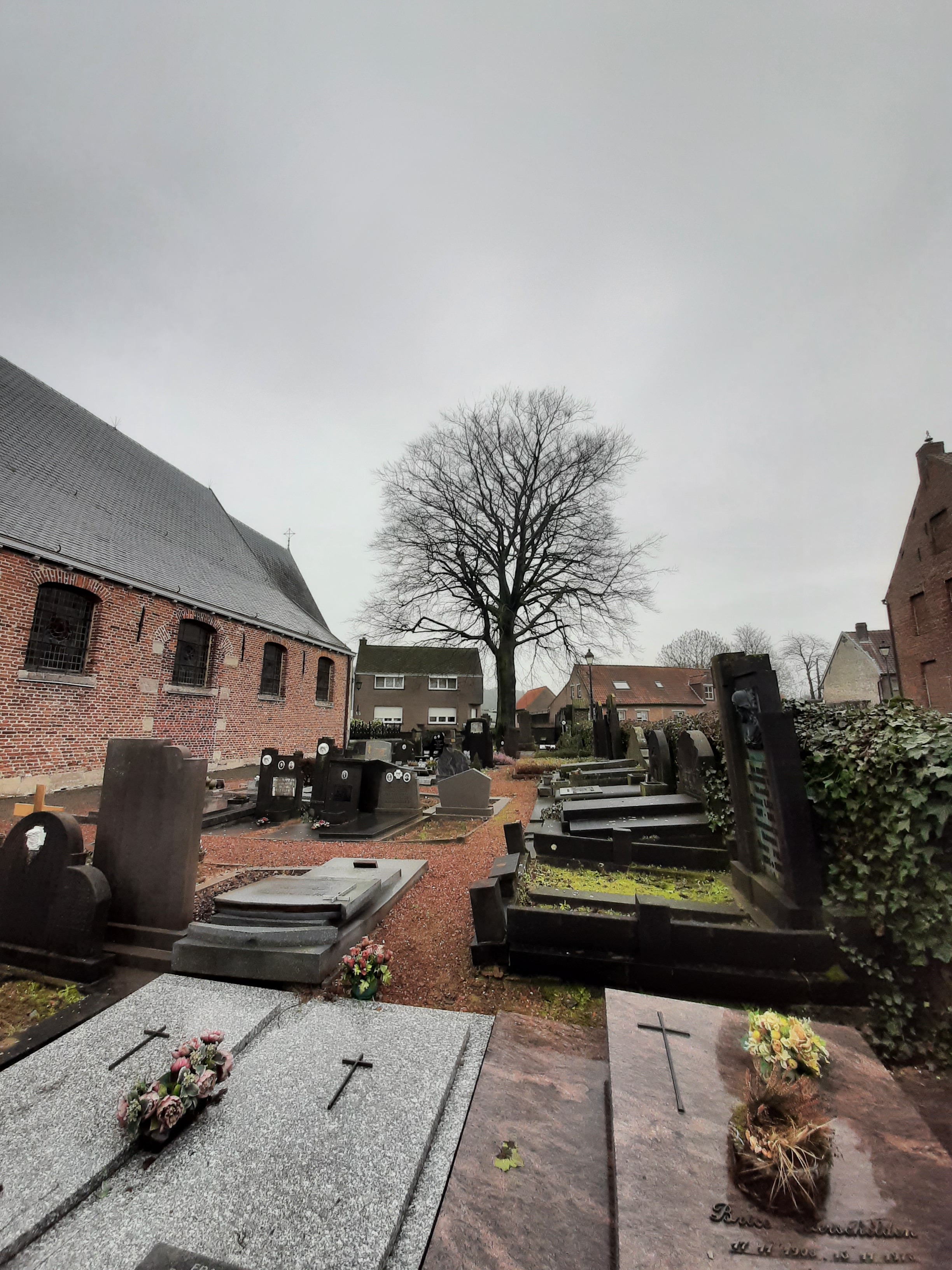 Opgaande bruine beuk als vredesboom. zicht op de habitus en het kerkhof.