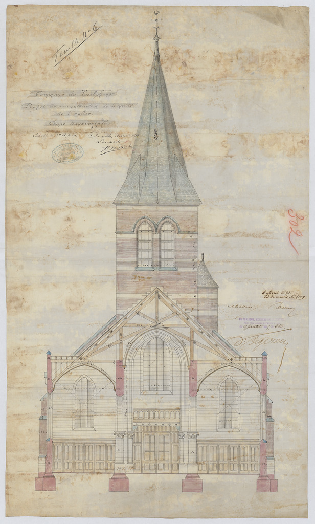 Opschrift: Commune de Teralphene. Projet de reconstruction de la moitié de l'église. Omschrijving plan: dwarsdoorsnede, dwarsdoorsnede naar het portaal Datum KCML: 06/04/1895 Archiefnummer: B0015
